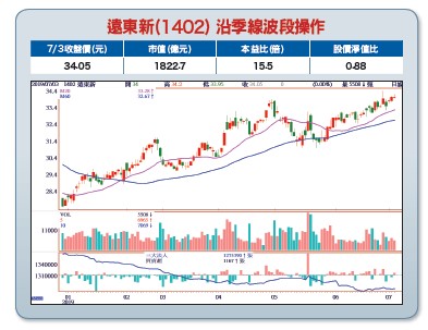 六月底G20川習會結果,如預期三千億美元商品暫緩課稅重啟談判,台股週一(七月一日)隨即在電子股的報復性反彈的帶動下,大漲一六四點,收在一○八九五點。記得去(二○一八)年十一月底川習會結果,也和這次類似,暫緩課稅重啟談判,台股隔週一激情大漲二五五點看到一○一四八點之後,即一路盤跌至今年一月初九三一九點,才觸底展開一波瘋狗浪行情到一一○九七點。不過當時剛好碰到蘋果新機出貨完又賣不好,電子股進入淡季,加上十二月Fed升息並預告今年再升二碼。七月若降息 短多中長空而這次卻是電子將進入傳統旺季(雖然旺季不是很旺),加上市場預期七月底Fed可能降息。所以看法如上期周刊專欄所言不變,短線衝高後提防利多出盡拉回整理,只是回檔幅度不會像上次川習會後見高一○一四八點後跌到九三一九點那麼大。預期應該是在一○五○○點至一一○○○點之間震盪整理,等待七月底Fed是否降息。若七月底Fed沒有降息,小心短期失望性賣壓,若七月降息則是短多中長空。指數短期在一○五○○至一一○○○點之間震盪整理,就是個股表現空間。在操作上可以短線電子,波段則仍以績優傳產股的除息行情為主。華為暫時解禁雖是利多,不過今年出貨高峰已過,所以相關供應鏈應視為報復性反彈看待。至於蘋概股雖進入新機拉貨旺季,不過今年拉貨量恐低於去年,所以蘋概股短期續航力雖有,但股價上面空間不要期望過高。遠東新估Q2每股獲利季增七成七至八月是除權息旺季,傳產績優股因獲利穩定成長,以及配息穩定,所以較具除息行情。遠東新(1402)因為第二季為PET瓶的需求旺季,將帶動聚酯營收向上。越南廠的產能利用率提升,包括紡織品和PET廠。PET在越南的產能利用率在第二季可望拉升到九成,至於PTA事業群在第二季將轉為獲利。法人預估第二季每股獲利可望較第一季○.四元,季增約七成左右。至於第三季,則受惠於轉投資亞泥、遠傳、裕民、東聯…等公司現金股息入帳,全年EPS估為二至二.三元,目前含息一.八元,股息殖利率約五.三%。