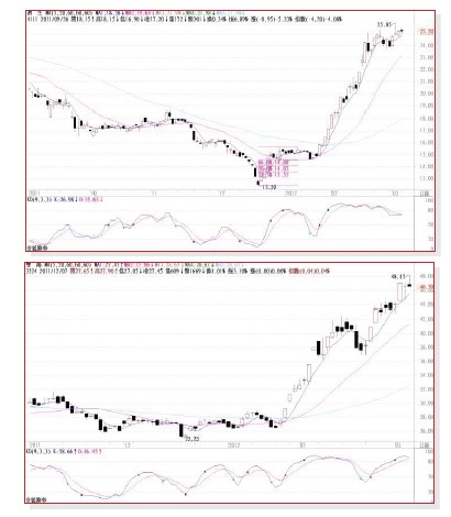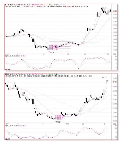 解說:(1)濟生於2011/12/01的高點16.35是最後一波下跌的高點,從12.5~15.65這一段為強勢反彈。(2)之後拉回守上漲段的弱勢拉回處14.6,之後於2012/01/17出現KD指標由下往上突破50多空線+三均糾結的耦合訊號,之後從這一天的收盤價15.8漲到25.85,其間的利潤高達六成多。同樣的我們也可以從KD指標於2012/01/31由下往上突破80軋空線續漲,形成軋空噴出行情。(1)雙鴻於2011/12/05的高點28.25是最後一波下跌的高點,從25.25至28.95這一段為過末跌高的翻空為多的訊號,之後修正拉回於2012/01/18出現KD指標由下往上突破50多空線+三均糾結的耦合效應,之後從這一天的收盤價29.25漲到48.15,其間的利潤高達六成多。(2)我們發現正常漲不停的股票都是沿著ma20往上漲,若出現小幅跌破ma20馬上又往上攻擊的訊號,就是發動起漲點。長多股票幾乎其日KD指標都會在50多空線之上的時間最多。解說:(1)曜越於2011/11/29的高點14.35是最後一波下跌的高點,從12.5~15.45這一段為突破14.35開始要翻空為多了。之後拉回守上漲段的中庸之道13.98,之後於2012/01/30出現KD指標由下往上突破50多空線+三均糾結的耦合訊號,之後從這一天的收盤價15.3漲到24.9,其間的利潤高達六成之多。(2)這邊我們可以單獨看粉紅色的ma20這一條均線,股價第一隻腳突破ma20之後小幅跌破ma20之後轉強往上噴出,完全符合葛蘭碧八大法則。解說:(1)昇達科於2011/12/05的高點28.8是最後一波下跌的高點,從23.85~28.3這一段為強勢反彈。之後拉回守上漲段的中庸之道26.08,之後於2012/01/18出現KD指標由下往上突破50多空線的訊號,之後從這一天的收盤價27.7漲到44.5,其間的利潤高達六成之多。(2)我們發現正常漲不停的股票都是沿著ma20往上漲,因此第二隻腳若可以回測ma20不破時就是要發動時。依照前面幾個範例可以知道,第二隻腳若可以守中庸之上,其後面走飆漲的機會最大。