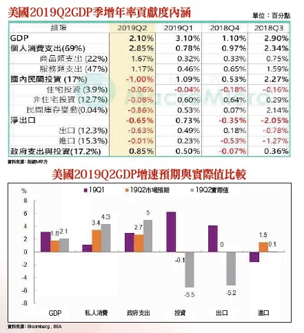 再者,中美雙方事實上都沒有期待,只是各自為了階段性的需要,互相配合演出,達成不同目的之時間拖延,剛好各取所需。白宮經濟顧問庫德洛(Larry Kudlow)日前就表示,本次中美貿易談判不會達成重大協議,但美方仍盼望,新一輪的磋商能夠為雙方未來即將達成的協議鋪路。川普先前接受記者提問時也表示,中國在貿易談判安排上正採取拖延策略,並表明對於中美是否達成協議並不會太介意,因為美國目前正從中國收取數十億美元的關稅。俗話說的好,沒有期待就不會有傷害,因此,本周就直接聚焦在降息後的市場反應,以及觀察周末八月二日晚上美股的走勢,都有可能是八月份的新指引。暫時先把FED降息的事擺一邊,就美股的發展而言,標普500指數今年來累計上漲近二○%,NASDAQ綜合指數上漲約二四%,而道瓊工業指數的漲幅也達一六.三%左右,市場不免擔憂美國的經濟增長力道能夠匹配嗎?單就美國第二季的GDP季增年率來看,二.一%是優於預期的。美國消費維持強勁 投資不足將成隱憂主要動能來自消費者支出的大幅提升,若從細項來看,消費部門(占比六九.一%)季增年率為四.三%,優於預期的四.○%及前值一.一%;商品、服務類消費季增年率分別為八.三%(前值為一.五%)及二.五%(前值為一.○%),商品項目消費已擺脫去年底負面影響,並在第一季淡季過去後配合退稅效果,年增強勁來到三.七%水準。觀察耐久財及非耐久財部分,季比皆顯著增加,細項中包括服務、房屋、汽油及其他能源、家具及家庭設備、娛樂消遣、食品、服飾及皮鞋、汽車及其零件等增幅皆較前季增加。由GDP增量的貢獻度來看,個人消費支出就貢獻了二.八五個百分點,政府支出貢獻了○.八五個百分點,為第二季主要貢獻項目。顯然,佔美國GDP約七成的個人消費支出仍然是未來經濟增長的關鍵,提供了我們追蹤的方向。拖累經濟數據的部分,則是企業投資的不足,美國民間投資季增年率為負五.五%(前值為六.二%),觀察細項,最關鍵的非住宅投資快速回落,季增年率為負○.六%(前值為四.四%),因此,對GDP的貢獻度翻負,拖累約○.○六個百分點(前值貢獻度為○.六個百分點)。