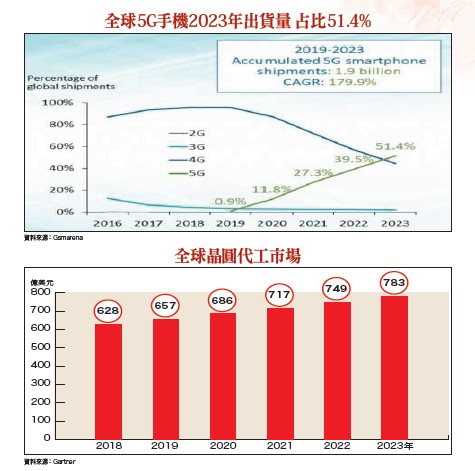現階段,伴隨消費性電子之一的「智慧型手機」全球大廠APPLE、華為,今年度重要新機即將先後上市,接下來有望持續拉高手機AP處理器應用台積電先進七奈米製程,下單予台積電的晶圓代工服務訂單數量。另一方面,儘管目前全球支持5G高速通訊網路的新世代手機與網通基地台通訊設備,還無法稱得上十分普及,但根據研究機構Canalys預測指出,到二○二三年底,全球「5G智慧型手機」出貨量將超過4G機型;全球未來五年內,將累計出貨約一九億支5G手機。Canalys預估報告顯示,全球5G手機出貨量將於二○二三年大幅成長達八億支,也將占整體智慧型手機出貨量五一.四○%;二○一九年至二○二三年間,複合年成長率(CAGR)為一七九.九○%,出貨量將正式超越4G手機。因此,對於現階段已是全球5G手機「5G基頻數據機晶片」前二大廠的高通(Qualcomm)、聯發科而言,未來伴隨全球5G手機出貨量的不斷擴增之下,對於運用高階先進七奈米晶圓代工製程,製作出「5G基頻數據機晶片」的晶圓代工服務訂單數量,勢必也將隨之不斷拉高;如此一來,必定有很高的可能性,會持續下單給向來與它們具有良好、長期合作關係的台積電。台積電後續高毛利的七奈米高階先進製程,不僅產能利用率有機會持續處於滿載水位,甚至有可能進一步擴充產能規模,進而帶給台積電因高毛利製程產品出貨量擴增,所帶來產品組合優化、毛利率拉高,全年營收獲利因此跟進成長、走高的營運利多。