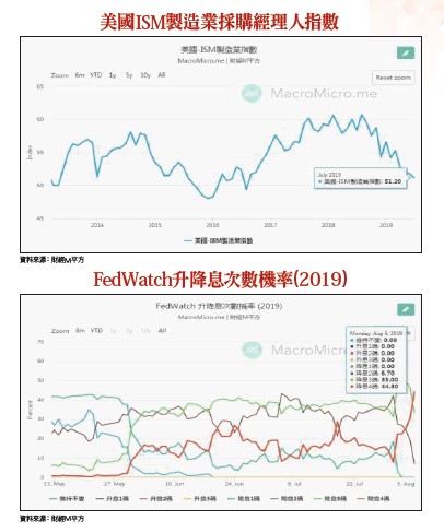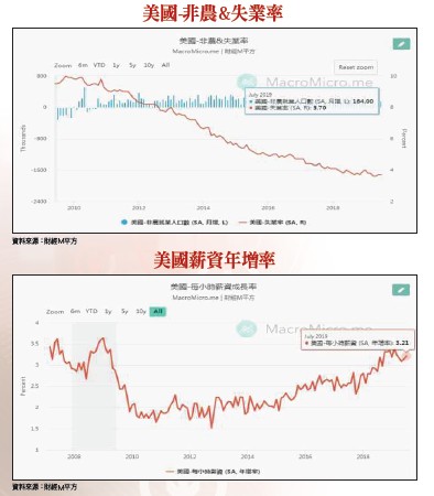 第三,由於人民幣走勢將牽動亞洲新興市場的匯率走向,可能進而干擾外資回流亞洲市場的積極度,將攸關反彈波的強度。美國川普曾一再表示,美國必須與中國達成更好的貿易協議,而不僅僅就是一個平等的協議,中國須做很多事情才能扭轉與美國的貿易談判,且美國有能力進一步提高關稅。關稅的措施不只直擊中國的製造業,也將損及諸多美國科技跨國企業。例如,iPhone、iPad、Mac、AirPods和 Apple TV等多款Apple的產品也可能難逃一劫,市場估計,最新關稅措施恐讓蘋果獲利減少三十億美元。因此,Apple也是近期股市重挫的震央之一。消費者科技協會(CTA)估計,這一輪關稅將影響價值約四五○億美元的手機,三九○億美元的筆電和平板電腦,五四億美元的遊戲機。薪資增長支撐GDP穩健擴張 PMI不佳反讓FED有降息理由暫時先不管股市如何修復,到底美國景氣基本面何來的底氣?能讓川普如此肆無忌憚。根據新公布的美國非農新增人數統計,七月非農新增就業人口達十六.四萬人,符合預期。統計今年一至七月,美國非農新增就業人數為一一五.六萬人,平均每月新增就業人數為十六.五一萬人,已連續一○六個月增加,為歷史上最長紀錄;其中,製造業新增就業由六月的一.二萬人增至一.六萬人,為六個月來最高。