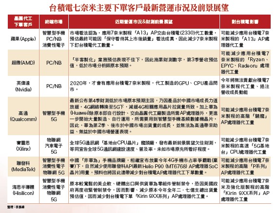 高通,全球行動裝置應用處理器、通訊晶片龍頭廠,於近期公布最新財報與財測結果後股價重挫。經營高層表示,第四季財測低於市場預期,乃是因為產品於中國市場成長力道出現放緩,以及4G網絡轉換至5G下,減緩4G相關應用晶片拉貨量所致。加上華為(Huawei)除原本即自行設計、交由晶圓代工廠製造所需AP處理器外,更進一步開始大量製造、自行運用,所需要用到智慧型手機基頻數據機晶片,因此,華為於中國市場出貨量的成長,並無法為高通帶來助益,不利其於中國市場營運表現。同時,中國「非華為」手機品牌廠,近期已相繼宣布,將放棄今年4G手機市占率的爭霸戰(棄賽)下,自然也將因此減少使用高通AP處理器,不利高通後市營收表現。全球PC/NB處理器(CPU)大廠超微執行長蘇姿丰,近期發表有關後市營運展望最新看法時指出,對於旗下三大CPU、GPU產品線的未來深具信心,Ryzen、EPYC、Radeon後市銷售均有望成長量增;惟半客製化業務預估表現不佳下,因此拖累財測數字,第三季營收預估值低於市場分析師原本預期,因此拖累超微股價於七月底公布財測後,一度重挫達五%以上。全球5G通訊網「基地台CPU晶片」龍頭廠賽靈思,最新發布前景展望欠佳的財測結果,等同宣告全球5G通訊網相關建置速度,並未如市場原先所看好般,可加速建置速度,加快市場5G應用發展進度。不過,與提供下游往來廠商晶圓代工服務的終端客戶,近期相繼發表不如市場原先預期、前景展望透明度降低的最新一季財測報告,台積電卻仍然持續看好今年下半年度營收成長動能,仍自評有機會於年終交出一張明顯優於全球半導體晶圓代工產業的亮眼成績單。