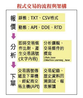 隨著消費型電腦、雲端伺服器的普及,以及程式教育的扎根,運用網路下單及程式交易軟體進行交易,已漸漸從法人圈擴大至一般投資人,且年齡層有擴大趨勢。明年三月二十三日,臺灣證券交易所將把撮合制度由現行的五秒分盤撮合改成逐筆撮合後,預期證券市場的法人圈因為不用再忍受五秒暗黑期,程式交易的應用將會逐月逐年成長。未來程式交易在臺灣證券與期貨市場的應用,將會在參與者以及成交量的結構方面有大幅度的成長。但並不是每位投資人都對電腦的軟體、硬體架構及基本操作有相當的熟稔,所以也造成了一些投資人對程式交易有偏差的認知。本篇就針對目前台灣以及國際市場上常見的程式交易應用,跟投資朋友們做分享,投資人可以依據自身對電腦的熟稔度以及需求,選擇合適的軟體平台及工具。一、什麼是程式交易?程式交易包含了「程式設計基礎」以及「交易分析與技巧應用」,而「程式設計」又分為「資料結構」與「演算法」。什麼是資料結構?就是資料的新增儲存、修改、刪除、查詢等功能應用。例如把每筆成交資料按日期、時間、成交價格、成交數量的欄位順序儲存,再依日期、時間區段(一分鐘線、六十分鐘線、日線)去取出成交資料,組合成使用者所需要的K線、均線,就是一種資料結構應用的概念。什麼是「演算法」?簡言之,就是解決問題的方法步驟。例如我想要電腦程式幫我在五日均線向上穿過八日均線後,就進場買進台指期貨。在程式交易的步驟就是先宣告兩個變數,一個放五日均線,另一個放八日均線,接著我告訴電腦,條件一:如果前一根K線收盤時,五日均線大於前值,而當根K線的五日均線又比前值大;條件二:如果當根K線的五日均線同時大於八日均線。當兩個條件都成立時,就執行步驟一的買進動作。這就是一種最基本的程式交易「演算法」。「交易分析」則好比說KD隨機指標交叉買賣的模式套用在六十分鐘K,是要設定9K9D還是3K3D,哪一組參數得到獲勝率高、賺賠比大;交易的技巧應用例如突破均線後市價追買,還是掛限價低買;停損是要固定式還是移動式等,都是交易技巧應用的範圍。二、程式交易的應用三層面一盤狹義的程式交易,是指利用軟體與程式,「全自動化的接收即時報價、分析資料比對條件、執行交易」。所以程式交易包含三大技術層面,就是:一、即時報價資料的接收與資料歸納儲存;二、資料分析與交易條件的比對;三、串接證券期貨公司的下單訊息接收介面與測試、下單委託與委託管理、未成交與已成交部位的管理,甚至是總資金或總部位的風險值管理。所以程式交易所涉及的軟體技術層面,真的不是一般投資人所想像的那麼簡單!也不是坊間一些短期的電腦技職補習班或資訊公司,開個六堂、十堂課就可以飛天遁地的雕蟲小技!投資人如果想跨進程式交易的領域,最好還是依據自己的資訊學習程度與理解能力、市場經驗,選擇合適的程式交易應用工具。