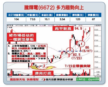 儘管在外資法人調節動作不斷下,仍持續壓抑指數上攻氣勢,從七月三十一日至八月二十日為止,累計賣超金額已達一一一八.六二億元。隨著美中貿易戰緩解,不僅美方再度釋出善意,推遲對手機、筆電、部分服飾、鞋類及消費品等大部分商品加徵關稅時間至十二月十五日,包含蘋果Mac、iPhone和iPad等產品暫時逃過關稅劫,甚至對華為禁令寬限期再延九十天至十一月十九日,華為供應鏈獲喘息空間,也激勵相關概念股同步走揚。加上受惠台商資金大舉回台,實質出口力道明顯回升,預料下半年國內景氣還會再更好,主計總處於八月十六日也將第一季GDP從原先統計值一.七一%再上修至一.八三%,第二季GDP初步統計為二.四%,第三、四季GDP預測值則分別為二.六七%和二.九○%,顯見在下半年經濟可望逐步復甦成長向上,以及國家隊護盤的加持下,可以看到為何包括投信法人、壽險資金、業內大戶及中實戶群等敢有恃無恐拚命作價拉抬特定中小型業績成長股,自然有其原因。雖然在加權指數還未能突破站穩於月線及季線之前,預期整體行情仍將續處於一○三○○至一○六○○點區間反覆震盪機率居大,不過,就如老師先前所言:「八月利空淬煉底部,好股票低點有限,有拉回才有低接買點的好機會」,果然這一路以來,我們領先市場與大家分享的股票,不論是【錶中之霸】6278台表科、雍正王朝【四爺】6683雍智科、【小天王】6669緯穎、【世說新語】3661世芯-KY、【快打炫風】8499鼎炫-KY、【台表科2】6672騰輝電等中小型轉機成長股,檔檔強悍,加入Line@,成為我們的好友,好事就是會發生。【個股推薦】騰輝電(6672)主要從事生產與銷售印刷電路板原料銅箔基板、PP黏合片以及鋁基板。主要利基題材有:(1)第二季毛利率創高,上半年每股賺三.一二元:受惠特殊材料如散熱鋁基板、軍工航天高階聚醯亞胺(PI)基板等產品持續成長,以及軟硬結合PP受智慧型手機多鏡頭需求與電池模組應用成長,帶動第二季毛利率大幅提升,營收十三.一四億元,毛利率二八.○九%,分別季增四.○三%、二.四一%,毛利率更創下歷史新高,上半年合併營收二五.七七億元,毛利率二六.九一%,稅後純益二.○九億元,EPS三.一二元,七月合併營收四.九四億元,年增八.四一%,月增一五.一九%,創掛牌以來新高。(2)搶進5G領域告捷,下半年營運看旺:騰輝電主要深耕高單價、高毛利的利基型產品,涵蓋軍工、航太、醫療、國防及車載散熱等高階利基型應用市場,隨著5G通訊、電動車、自駕車等時代來臨,公司投入各種高頻高速材料研發多年,針對5G龐大商機,已開發出全系利超過十種可滿足5G各種未來應用的產品,目前已取得三個產品的認證,以網通卡、網通設備周邊產品為主,業界也傳出,騰輝電通過的三個認證中,有一個是思科的周邊設備,已小量出貨。騰輝電也是聯想5G筆電主機板的銅箔基板供應商,早已開始穩定量產出貨,相關布局下半年開始發酵,受惠軍工、航太、國防及電動車出貨暢旺,5G相關品項開始進入收割期,以及高頻高速材料銷售明顯突破,不僅第三季營收與獲利有望挑戰新高,全年獲利再創新高可期。【操作建議】低接不追高,配合頭肩底打底完全,均線震盪走揚向上、低檔量能增溫,以及業內法人心態偏多不變,只要守穩八十七元關卡不破,逢低仍可留意(※基本面資料若有異動,依公開資訊觀測站最新訊息為主)。基於風險考量,設好停損停利(詳見附圖說明)。