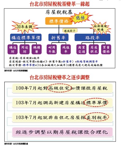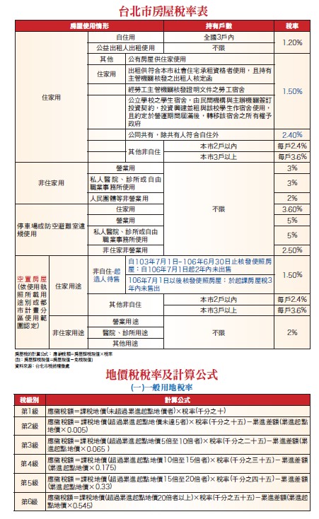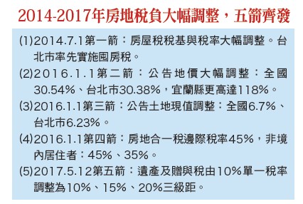 最近台北市政府提出合併課徵房地持有稅議題,雖然各地方政府看法不一,惟一般民眾更關心的是稅負是否增加,尤其對於當前政府刻正積極推動的都市更新與危老重建之後,為何稅負暴增問題更是充滿疑慮,此可由都更整合過程住戶所提出的兩大關鍵問題,其一為「一坪換幾坪?」,其二為「稅負增加多少?」見其梗概。其實,如能將房屋稅與地價稅合併為房產稅(Property tax),本質上應是好事一樁,為何一般民眾卻又充滿疑慮?此一問題根源可由二○一四年七月一日台北市率先實施囤房稅,其後包括公告地價與公告土地現值調整,房地合一稅實施與遺產及贈與稅稅率調整等,短期間五箭齊發(詳請參閱附表),導致房市景氣重挫迄今,一般民眾記憶猶新,而這也正是近年高總價豪宅交易幾近停擺的原因之一。一、房地稅制太複雜,一般民眾霧煞煞 ─一地五價?一屋五價?房屋稅與地價稅大幅調漲之後,不僅一般民眾抱怨連連,各地方政府莫不為此傷透腦筋,尤其是對於短期稅負暴增之合理性更是無法解釋清楚,其因在於一般民眾不曉得大幅增加的稅收花在哪裡?只知道地方政府的預算有一大部分用在公務員薪水。其次,台灣房地產持有稅雖遠較先進國家為低,但相關稅目卻相當繁雜,例如「一地五價(公告地價、申報地價、公告土地現值、申報土地移轉現值、市價)」,以及「一屋五價(工程造價、房屋標準價格、房屋現值、契價、市價)」等錯綜複雜問題,若非專業人士,實在很難了解清楚,因此,如能加以簡化合併,絕對是好事一樁,不過就事論事,其間工程之浩大,恐非僅憑理想即可實現﹗此一問題只要瀏覽一下房屋稅與地價稅稅率表,即可一目了然(詳請參閱附表)。