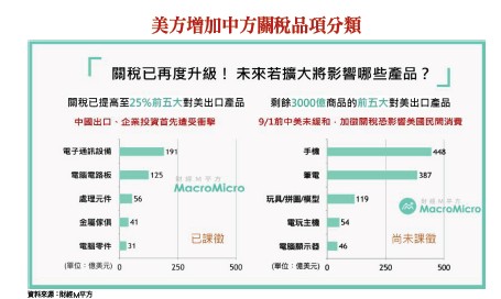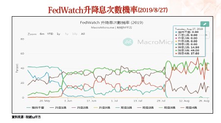 中國方面,二五○○億美元大陸輸美商品所加徵之二五%關稅,將自十月一日提升為三○%,範圍包括約一九一億美元的電子通訊設備、約一二五億美元之電腦電路板、約五六億美元的處理器、約四一億元的座椅除外金屬家具、約三十一億元之電腦零件、約二十九億元之木製家具、約二十七億元之靜態變頻器、二十五億美元之聚乙烯、二十五億元之木框架座椅、約二十三億美元之汽車零件等。九月一日起對其餘三二五○億美元未延後實施的陸貨,由加徵一○%改為加徵一五%關稅,細項包括健身追蹤器、智慧揚聲器、藍芽耳機、智慧手錶、十三.五吋以下平面電視、錄放影機或其他播放器、隨身碟和硬碟等資料儲存設備、電話機零件、塑膠製品、多功能印表機等;而手機、筆電、遊戲機、玩具、電腦螢幕及部分衣服、鞋子等產品,自十二月十五日起將課徵一五%關稅。我們合理的推測,先前一○%的關稅或許不會影響iPhone銷售量,也不至於影響台灣的零組件供應鏈,但未來若提高至三○%呢?這將會是個大威脅,台商不降價可能會被陸廠取代,降價則損及毛利率。目前市場法人推估,面對iPhone未來可能出貨量下降,為了維持相同水準的出貨量,以撐住工廠產能利用率,報價上相對積極讓步,零組件供應鏈的報價已比去年同期下跌約五~一○%,這對原先毛利率不及二○%以上的諸多台廠,影響財報之程度十分巨大,而且股價通常會提前反應,這已預告今年第四季台股被下修的壓力快速增加之中。上述關稅逐一執行後,法人預估對中、美雙方GDP之影響,對美國將影響○.四五%,對中國影響○.八五%,將連帶影響股市整體估值,指數型ETF被贖回的壓力也增加。市場十眼所視 聚焦在FED的寬鬆如前所述,既然基本變數仍多,成就股市的期待自然落在各大央行的寬鬆政策了。觀察美國聯準會(Fed)主席Powell於八月二十三日在 Jackson Hole舉行的全球央行年會演說,其重申美國經濟仍處於健康水準,就業增速穩健,消費者支出支撐溫和的經濟增速。