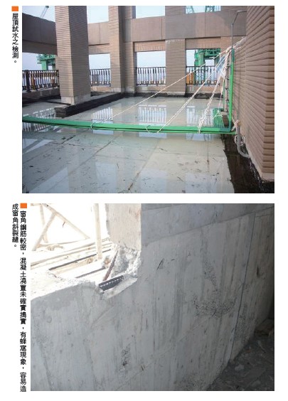 此外,混凝土澆置後,樓版面會受天氣影響,譬如日曬、風吹而產生的乾縮現象,容易引起滲水,所以當混凝土澆置抹平後,應立即鋪蓋不透氣的PP版,減少混凝土面之乾縮。因此,建議在結構體完成,尚未進行防水施工前,應當先進行第一次結構體試水一天,了解並確保混凝土澆置的密合性,若能在此時即達到防水要求,才可能確保防水最高等級標準。二、屋頂施工要點:屋頂版與版筋間設計時間距應加密,規劃設計不可過大,避免混凝土澆置時,形成網狀龜裂、產生蜂窩進而導致滲水。屋突層底版設計時應儘可能高於屋頂版,以期降低屋突層與屋底層間,產生二次澆置縫的滲水問題。另外,洩水坡度要確實避免積水,並建議在未施作防水前試水一天,確保結構體的防水性。其次,施作防水工程時,女兒牆和樓板之間的夾角最好要圓潤,且在屋頂防水施工完成後,應做三天以上全面試水檢測,確認完全不漏水後再進行地坪裝修面材的鋪貼。三、窗戶施工要點:當地震來襲時,牆的窗角是最容易受力集中的位置,需做適當的補強,並依設計圖的距離施作,太遠無法發揮抗裂效用,應在距離窗角最短處定位綁紮,才能發揮補強效果。此外,由於窗角加上補強筋後,會使得鋼筋間的縫隙變小,導致混凝土澆置容易產生蜂窩現象,而衍生日後滲水問題,施工時應格外留意。