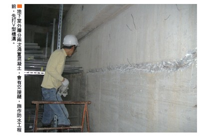 若鋁窗與牆間縫隙太小,會使得嵌縫間的水泥無法將窗框填滿,遇到較大雨勢即會產生滲水。此外,嵌縫間的水泥強度也必須足夠,避免日後產生裂縫而引發滲水。另外,在澆置時,應確實將窗框下的混凝土搗實,並用木槌敲擊加以確認,避免澆置的空氣未完全排出,使得混凝土無法確實填滿,而導致日後滲水。四、地下室外牆施工要點:儘管地下室非生活中的主要空間,但大樓的機電及停車場都配置在此,一旦長期漏水,除影響居住品質也有礙觀瞻,如造成柱牆鋼筋鏽蝕,更有可能影響大樓的結構安全。為此,地下室外牆各樓層儘可能一次施作,若施工有困難必須分開二次施作時,於二次施作處須確實沖洗,並於地下室外牆泥作粉刷前,打V型槽溝並以防水水泥砂漿補平。另外,混凝土澆置前,地下室外牆二次交接處之牆底須充分清洗乾淨,以有效解決樓層接縫及地下室外牆二次接縫之滲水問題。以上所述係結構體施工時應特別注意的關鍵點,房子不漏水,其實不是只靠後續的防水工程,而是取決於一開始建築設計及施工,每個細節是否專業用心去做全面考量,以確保建築結構的施工品質,避免混凝土產生裂縫,這才是避免漏水最有效的預防之道。·