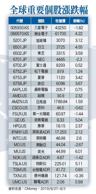 日前有一則不算醒目的新聞,號稱全球景氣金絲雀的南韓,其統計局發布八月消費者物價指數(CPI),赫然出現年增率為零,創下一九六五年該國開始公布通膨資料以來最低水準,對照韓國第二季度GDP增幅從先前預告的一.一%下修至一%,出口亦比先前估計的更加疲軟,莫非也步入日本失落二十年的通縮年代?再看歐洲第一大經濟體德國,其第二季GDP季減○.一%,由於德國經濟高度倚賴出口,佔GDP約四七%,遠高於英國與法國的三○%(美國出口僅佔GDP的一二%),顯然外部需求十分疲弱。根據德國經濟研究所(DIW)資料顯示,繼第二季度GDP衰退○.一%之後,第三季可能再萎縮○.二%,該機構表示,製造業正處於危機之中,並且正在拖累服務業,而英國無協議脫歐和義大利政治不穩定的威脅都將延長此慣性。美國方面,新公布的八月ISM製造業PMI指數為四九.一,不但低於市場預期的五一.二,且進一步跌落五十以下緊縮區間。其中,領先指標新訂單為四九.一,低於前值五一.二,生產指數四七.二,低於前值五○.八,雙雙滑落至榮枯線以下。代表海外需求的新出口訂單更是大幅下跌至四三.三,遠低於前值四八.一,創二○○九年以來最低水準。雇用指數亦下滑至四七.四,大幅低於前值五一.七,正式進入緊縮區間,這可能快速傳導至就業市場,進一步影響消費擴張。由於美國是全球經濟龍頭,更是股市龍頭,上述數據的影響性非同小可。俗話說「春江水暖鴨先知」,根據追蹤美股流動性的TrimTabs投資研究機構發布調查指出,美國企業內部人士八月以來平均每日賣出六億美元股票,為二○○七年金融危機爆發前一年以來最高水準,顯然,九月十八日美國FOMC利率會議是否符合市場期待,將成為股市發展強弱關鍵。