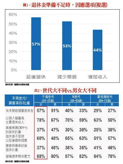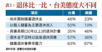 人在年輕時,為事業、家庭打拚時,很少會想到退休生活,但一旦步入四十歲的中年時期,「我想過什麼樣的退休生活?」、「退休金該準備多少才夠?」的念頭,就會不時出現在腦中。退休金要靠自己儲蓄根據《富蘭克林坦伯頓基金集團退休收入策略暨預期(RISE)調查》在進行跨國分析時發現,台灣與美國民眾在規劃退休金時,最依賴的皆是「自己」,各佔三三%及三八%,顯示都了解也認同退休金儲備是「自身」的責任。但進一步觀察準備的實際作為,台灣還沒開始儲蓄退休金的比重為四六%,則遠高於美國的二三%,而台灣的「即將退休者」中,自認退休財務準備上呈現落後有七三%,也略高於美國的六六%(表一)。在該調查的細項分析也指出,有四六%的台灣人將「退休」列為投資理財的首要目的,且有五四%已開始準備退休金,但其中卻有高達七三%的人表示進度已落後,此外,約有六五%缺乏長期退休計畫,甚至有五七%以「延後退休」以支應老後生活,造成八三%的人因儲備退休金承受壓力(圖一)。由表一也可看到,台灣及美國民眾在退休準備上,都感覺壓力不小,各有八三%及六七%,但在應對退休準備的壓力,投資理財的決策行為也有頗大差異,例如當存款等準備不足而無法按原計畫退休時,美國有七%會調整投資策略改以成長型標的為主,而台灣則有二三%。此外,世代不同,以及男女不同,也可以發現,他們在退休金準備的觀念,以及準備時間也不同。千禧世代退休壓力大