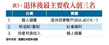 另外,賴彥穎也建議,「退休族」可以將部分保單活化,把部分壽險轉為年金,例如有兩張壽險保單,就可以向保險公司討論把其中一張轉為年金或長照保單,讓退休後的財富在只出不進的情況下,能有更多靈活運用空間。富蘭克林坦伯頓多元資產團隊客戶投資組合經理人唐崢輝則建議,檢視退休理財需求可分累積期、過渡期、退休期三個階段。「累積期」著重提高儲蓄率,長期投資提高資產增值空間;五十歲以上的「過渡期」,須因應工作或家庭成員變動等差異,調整不同資產配置需求;「退休期」,需求差異更為明顯,可量身訂做以創造退休收入來源。專家可提供退休諮詢服務此外,根據富蘭克林的該項調查結果也顯示,台灣民眾在多項退休準備包括儲蓄退休金進度、來源、可續性等表現,相對低於美國,但也發現高達八一%的台灣受訪者,願意為退休提高投資金額,並且向專家提出諮詢服務,均有利於減輕退休過程的壓力值。而願意尋求專家諮詢服務者,在退休準備方面有較好的表現,包括退休準備落後的情況較少,也較清楚政府的福利政策和開始準備退休金等。富蘭克林證券投顧分析,台灣及美國民眾在退休準備進度的差異及壓力值差異,可能來自美國以退休投資帳戶為主要退休金來源,而台灣仍以保守的儲蓄(活存、定存)為主,可能導致退休準備過程牛步化(表三)。此外,根據美國政府審計辦公室二○一七年十月針對有六十五歲以上成員的家庭調查顯示,美國家庭的退休收入來源有三三%來自社會保險,二九%來自雇主退休計畫及個人退休儲蓄,另有三四%依賴薪資收入,這也說明為何目前美國超過六十五歲但仍在工作的人口數達八百九十萬人,甚至有三五.五%「已退休人士」決定重返職場,而台灣也有五七%受訪者表示,以「延後退休」來彌補退休缺口。