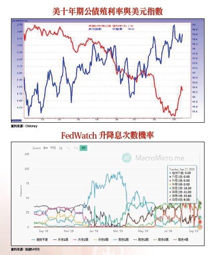 過去一周影響金融市場最大的事,莫過於美、歐公債連續大跌,絲毫無視於歐洲央行QE政策之公布,促使公債市場殖利率快速拉升,美國十年期公債殖利率於短短八個交易日,殖利率由約一.四二%快速拉升至約一.九%。果然,過度擁擠的交易,一旦部分資金引動獲利了結,波動幅度都十分巨大,幸好本次殖利率的拉升尚未明顯波及股市。聚焦FOMC會後聲明市場反應不過,目前全球金融市場的訊息面處於「天無三日晴,地無三里平」的狀態,投資人好不容易有個周末假日的喘息時間,又出現沙國油田的恐攻事件,九月十六日布蘭特原油期貨還一度暴漲一九%,創下史上最大盤中漲幅,著實讓人捏一把冷汗,幸虧國際油價的暴漲未再進一步推升公債殖利率,否則股市很難不被波及。油價暴漲之後,擴散效應如何呢?由於通膨率(消費者物價指數CPI)攸關美國聯準會FED未來的貨幣政策取向,而油價的影響既深又廣,投資人不能不重視。雖然市場預估沙國石油公司(Aramco)仍有三十五至四十天原油庫存供應量可滿足既有合約,但本次影響的產能高達每日五七○萬桶,為沙國歷史上遭遇的最大供應中斷,佔沙特目前產量近六成,短時間要完全恢復不易,必須進一步留意沙國的對外說明。此事件確實也干擾了市場預期FED降息空間的機率,根據聯邦利率期貨市場十七日資料顯示,今年降息三次的機率下滑至三三.六%,降息四次的機率陡降至九%,降息兩次的機率上升至四一%,市場擔憂油價的暴漲可能限縮FED貨幣寬鬆的發揮空間。甚至最新FedWatch數據顯示,FED維持利率不變的可能性,已從一個月前的零,暴增至四八%。