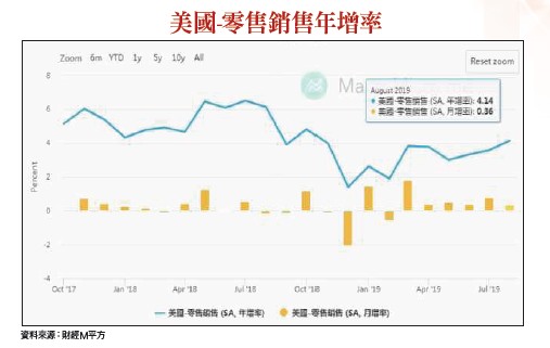 由於川普總統十分在意美股的發展,尤其是在民調落後之際,除了前述打壓油價創造貨幣寬鬆之空間以外,景氣基本面不能過於疲弱也屬必要條件之一。觀察新公布的美國零售銷售數據,投資人可以暫時鬆一口氣,八月零售銷售較七月增加○.四%,優於市場預估的○.二%。扣除汽車、汽油、建材與食品服務後,八月的核心零售銷售在七月成長○.九%的高基期下,仍月增○.三%,顯示消費支出仍屬強勁。在十三類主要零售店中,有六大類的銷售比七月成長,其中汽車銷售額月增一.八%,年增率達六.七六%遠超上月的三.四三%。電子商務(網購)年增一六.○三%優於前期的十四.七七%並再創新高,為連續第八個月成長;原先最疲弱的耐久財(建築園藝、家具)也雙雙止穩,年增由負轉正。綜合觀之,美國七至八月的零售銷售皆優於預期,顯示美國消費支出仍穩健,有助於支撐第三季的經濟成長率,緩和市場對經濟衰退的疑慮。另一方面,九月密大消費者信心指數為九二,優於前期的八九.八,整體經濟並無快速轉向之風險。至於市場關注的中、美關係,雖然我們並不期待達成協議,但至少進一步惡化的機率已降低。