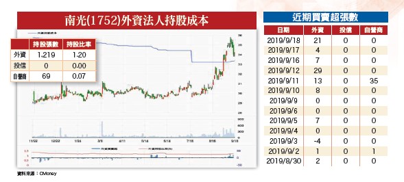 根據八月份上市櫃公司的整體營收數據,達二.九五兆元新台幣,月減○.二七%,年減三.一三%,雖雙雙衰退,但半導體產業以一三.七九%的月增率拔得頭籌,暫時還能支撐整體大盤的攻堅步伐。這主要得歸功於半導體指標大廠台積電、聯發科八月業績的爆發,雙雙繳出年增雙位數的成績。不過,反過來說,如果營收表現如此亮麗,而股價走勢反向走弱,反而代表今年普遍提前拉貨的情形下,營收高峰可能已過,投資人要保持警覺性。另一種情境是,受到國際利空的外部因素干擾,或者外資不再連續性買超台股,加權指數僅能維持高檔區間整理,無法創高,盤面結構僅有個股表現。此時,交易策略上宜暫時避開依賴出口的電子族群,轉進景氣循環關聯度相對較低的生技族群,可降低外部利空之衝擊。南光營收創新高 獲利穩健成長可期生技族群中,依然有營收與獲利穩健成長的企業。例如南光(1752),近年積極發展國際市場,二○一九年中取得中國醫院通路標案,帶動八月營收創新高,值得投資人再度關注。觀察南光一至八月營收佔比,台灣占七四%,中國占一五%,日本占七%,美國占三%,東協占一%。台灣較去年成長約一%,中國營收卻倍數成長,主要是因兩項產品(降腦壓、急救藥)取得醫院標案,六月開始小量出貨,七至八月持續增溫,後續每個月將穩定出貨。