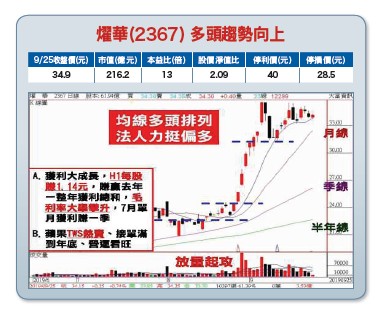 指數一如預期來到「萬一」關卡附近,在近關情怯及市場追價買盤轉趨謹慎保守下,短線震盪難免,老師在九月二十日正聲廣播節目或LINE@群組上就已經事先提醒過大家:「短線面臨關鍵時間轉折,提防將有多頭回馬槍的情況出現」,因此,在策略上除了暫不宜過度追價,並可視情況採取「高出低進」價差操作的應對外,在多頭格局不變,以及經濟面、資金面、籌碼面和技術面等均處於相對有利條件下,若有震盪拉回,可能又是另一次低接進場布局好機會。一、就經濟面角度,台商資金大舉回流,以及轉單效應加持,中央銀行、主計總處、中經院及台經院等紛紛上修下半年國內經濟成長力道,且預期明年整體經濟仍可望維持穩健向上成長趨勢,股市為經濟的櫥窗,若經濟能維持穩健成長向上,有助於股市作價反彈之持續。二、就資金面角度,台商大舉回台,至目前為止匯回資金已逾六千億元,財政部預期未來兩年內台商匯回資金將可高達一.七八兆部位,加上歐央及美聯準會聯袂降息,並重啟購債計畫,在全球資金氾濫、資金面不虞匱乏下,都將有利於股市作價反彈。三、就籌碼面角度,總統大選行情暖身起跑,國家隊護盤動作積極,內資法人大戶偏多氣氛濃厚,外資從八月三十日開始反手大買台股以來,至今累計買超金額已逾千億元,根據歷史經驗來看,每當外資反手大買台股時,至少都有二個月以上,有時還可維持八至十三個月的大行情可期,這一次從八月二十六日打底完成起漲以來,至目前為止還不到一個月時間,顯見後市行情還很大。【個股推薦】燿華(2367),多層印刷電路板製造商,也為國內第三大手機板製造商。主要利基題材有:(1)上半年出貨衝,營收、EPS雙創高:受惠美系客戶無線耳機產品成長快速,帶動軟硬結合板出貨旺盛,加上其他產品及應用貢獻,表現亮眼,第二季營收五六.三八億元,創歷史同期新高,稅前淨利六.五億元,季增一四八%,年增四五○%,EPS○.八一元,創單季歷史次高,毛利率大舉攀升至二一.二九%,季增五.六二個百分點。上半年營收一○四.七億元,首次上半年就突破百億關卡,EPS一.一四元,賺贏去年一整年一.○六元,營收及EPS皆創歷年同期新高。七月合併營收二○.一六億元,年增一八.六二%,公司自結單月EPS為○.三三元,已追平第一季水準。八月合併營收二○.七七億元,月增三%,年增一四.八五%,續創新高,優於預期。(2)蘋果TWS熱賣,接單滿到年底:燿華轉攻高毛利軟硬結合板、車用雷達板及任意層(Anylayer)產品等,其中軟硬結合板除既有的手機與電池模組外,也增加穿戴裝置、VR、無線耳機等客戶群,受惠穿戴式產品需求強勁,以及手機電池板等開始出貨,業績從第一季旺到年底,看好應用涵蓋廣泛且市場需求仍高,公司持續購入相關設備及擴充產能,預計下半年還會有新產能開出。