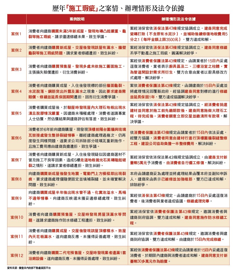 Q買房是人生大事,但高總價的買賣交易,牽涉太多建築專業知識與複雜法令條文,一不小心就很容易成為待宰肥羊。台灣推動都更困難,老屋遍佈全台各地,過去監工不確實,施工不良問題在二、三十年後逐漸浮現,有些利用裝修方式遮掩,一般民眾難以肉眼察覺,買房時反淪羊入虎口,成為購屋糾紛的受害者。想請問教授,不動產買賣糾紛頻繁,可否舉實際案例讓讀者深入了解,防患未然?A:針對各類型糾紛,本文以「施工瑕疵」為主題,經彙整歷年糾紛案例,探討其原因、處理情形與法令依據,提供民眾購屋參考。案例一:購買未滿五年的新成屋,後來發現地磚凸起,甚至龜裂等瑕疵。一般而言,現在的房屋結構保固至少十五年,建材也有高達五年的保固期,尤其信譽良好的建商,為了企業永續經營及品牌形象,又或者有餘屋尚未出清,即便保固期限已過也會照樣維修。最怕的是遇到「一案建商」,交屋完畢就結束營業,連負責人也找不到。