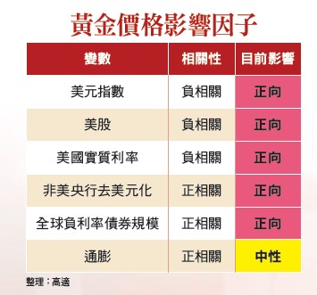 一旦就業市場緊縮,甚至企業開始裁員,對美國經濟僅存支柱|消費的負面衝擊將更加擴大(二○一八年美國消費增加值占美國GDP比重近七成),一旦民眾消費力趨緩或衰退,美國經濟走向衰退恐怕就只剩時間的問題。正因此種悲觀預期,市場情緒再度轉為保守,資金風險偏好降低,開始由風險性資產轉向避險資產移動,形成美元指數、美股自高檔拉回及日圓、美債、貴金屬價格彈升的結果。影響黃金價格非僅單一因素隨著市場情緒及資金流向轉變,將提供我們持續看好的貴金屬發展出新一波漲升行情的機會。但在此要提醒投資人,影響黃金價格走勢的因素並非只有一個,而是有多項變數相互影響後的結果,除了大家所熟知的美元指數、通膨、美國實質利率及美股外,近期來新增了非美央行去美元化及全球負利率債券規模等變數。若僅以太過簡化的邏輯來判斷未來行情,恐易產生誤判的情況。上述六項變數中,與黃金價格呈現負相關的有美元指數、美股及美國實質利率。由於黃金是以美元報價,當美元升值,非美國家就要用更多貨幣換取美元,等同於黃金漲價,將導致非美市場需求減少,不利黃金價格。美元及黃金都是國際儲備資產,若美元走強,相對削弱黃金作為儲備資產的地位。黃金也是避險資產之一,當美股(風險性資產)下跌,資金避險需求增加,將推升黃金的買盤力道,尤其目前已有不少債券陷入負利率,成為風險性資產,已不具避險功能,更加突顯黃金在避險資產的地位。黃金實際上是一種不生息的類美元資產,價格變化主要受其與生息美元資產間的相對收益表現影響。若用美國實質利率來衡量生息美元資產的殖利率,當實質利率上漲(如升息階段),市場對黃金需求降低,金價易下跌;當實質利率下跌(如降息階段),市場對黃金需求增加,金價易上漲。非美央行去美元化趨勢 將提供長期剛性需求