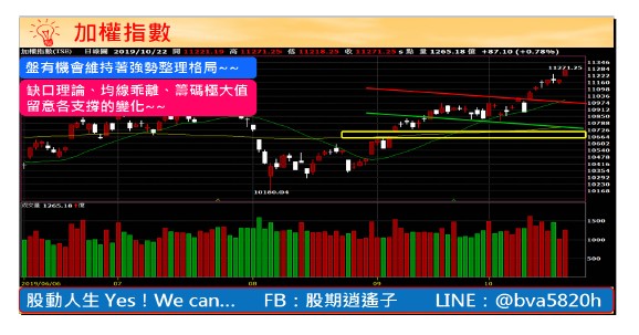 大盤的機會與風險回頭看加權指數,這一波在台積電帶動下,加權指數在十月二十二日當天,攻過去年的高點一一二七○,很可惜的是量能沒跟上,量縮代表盤進入高檔震盪的機率大,用震盪的方式來修正與均線的乖離!從籌碼來看,外資還是持續大幅買超台股,加上新台幣升值至近期的低點,熱錢湧入情況下,在中美貿易空窗期的這段期間,大盤有機會維持強勢整理格局,把握類股輪動,不過度追價,相信獲利還是有的。不過這邊還是要提醒投資朋友,中美貿易仍有不確定因素,加上經濟數據看起來沒這麼好,在強勢整理格局下,需要有更多的數據來支持,一旦有個風吹草動,行情容易修正回檔,嚴重一點,跌幅過深的話,就會引起多殺多!至於盤中進一步的即時訊息,歡迎大家加入群組─「股動人生」,重要轉折訊號不漏接,掌握飆股的攻擊訊號,好比上期周刊提到群組整理了一份飆股資料,在這一個禮拜鈺齊(9802)、國產(2504)皆有不錯表現,至於還有那些個股值得佈局呢?歡迎大家加入群組一起賺!