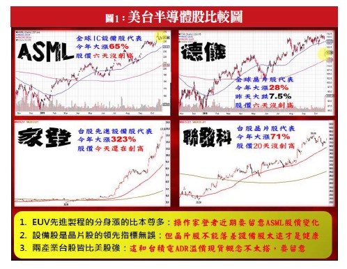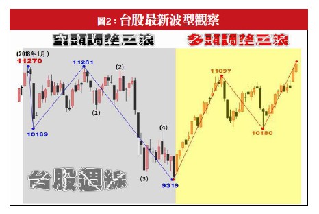 這種軍備競賽若是建立在上面的基礎上,就有泡沫的嫌疑,現在當然不會破,至少十月不會。但到了十一月後,大家就要想另一個層面的問題:股價到價了嗎?股價已經充分反映完未來的利多嗎?這次台積電的資本支出主要是購置EUV機台(極紫外光曝光機),這是先進製程最兇猛的推手。而提供這武器的軍火商則是荷商ASML,連動的台股則是做EUV光罩盒的家登。同理,台積電是幫晶片業者代工,所以觀察晶片業者的動向是觀察半導體景氣的領先指標。全球最大的泛晶片代表廠為德儀,而台灣最大的則是聯發科。參考圖一所示,今年至十月二十三日為止,居然設備股中我們的家登漲幅三二三%,遙遙領先ASML的六五%,而且ASML六天沒創高但家登還在創高。同理,聯發科今年漲幅七一%,也完勝德儀的二八%。最後,設備股是拿來用做晶圓代工,然後提供給晶片業者賣給電子下游,但設備股漲得比晶片股兇,這到底說明了什麼?這說明了台灣的半導體居然是全球的領頭羊,說明了分身溢價給本尊來追,大家覺得合理嗎?若答案是否定的,則十一月的相關供應鏈股,好則高姿態整理,差則盤頭,大幅走揚的機會一旦變小,則台股指數的空間勢必要被壓抑。【指數型態畫不出五波的啟示】台股十月雖創二○一八年一月一一二七○以來新高,但波型上屬調整浪結構,實在畫不出多頭五波的格局(見圖二),大家閒暇之餘不妨自己也畫畫看。