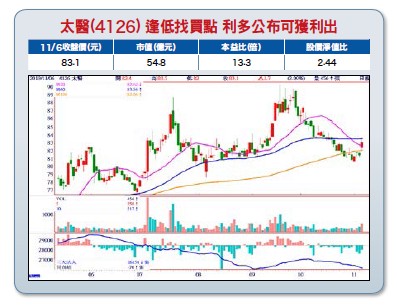 美股就業數據佳,激勵美股大漲再寫新高,加上美中貿易戰可望在本月簽署第一階段協議,台股在熱錢流入外資持續大買三王等權值股下,十一月六日指數亦再創一一六五三點近二十九年半新高。蘋果新機銷售佳 恐今年單月營收高峰針對後市看法仍不變,三王的大漲,除了外資熱錢流入大買之外,就是因為蘋概股十月營收佳,以及十一月十三日鴻海法說會,不過今年蘋果新機銷售雖優於預期,但十月或十一月營收也將是今年單月高峰,所以除非月中之前確認川習會簽署第一階段協議,否則近日營收公布應是提防短線利多出盡做短線漲多回馬槍。至於川習會簽署第一階段協議後,也應提防是短線利多出盡,短線漲多拉回整理完,以後要漲再漲。如此,也符合台股過去近十年來十月底、十一月初易見短線或波段高點回檔的原因,而十一月中前後通常為短線或波段低檔。加上從二○一一年以來,只要十月月線收中紅以上,則十一月月線都收黑的歷史經驗。也因指數可能隨時見高出現漲多的回馬槍洗盤整理,所以在選股上波段漲幅已大,與季線或年線等中長期均線乖離過大者盡量不追,免得追錯高檔股先住套房再說。接下來應該儘量以第四季優於第三季,且明年可望持續成長的低檔起漲股為主,短線進可攻退可守,中線波段可保護短線。前九月每股稅前盈餘 年增逾五成太醫(4126)以自有品牌PHASCO與代工並進發展,主力產品包含密閉式抽痰管約占營收四八%,袋類占一○%,傷口引流組一二%,其他產品如瓶類等占約三成。太醫自結今年前九月每股稅前盈餘為四.四元,年增五五%。日前已公告出售位於苗栗縣銅鑼鄉民生路14號、16號之土地及建物給裕利晟工,預估稅前處分利益約為一.八九億元,以股本六.六億元計,扣除所得稅後,每股貢獻度約二.二元,預計最快可在十月底、十一月初入帳。法人預估太醫今年本業稅後EPS上看四.五元。若加上業外出售土地利益,不排除今年EPS有上看六.七元上下能力。
