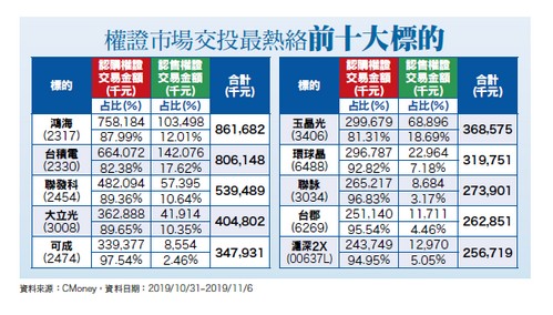 多方利多不斷:(1)FOMC順應市場降息一碼,(2)中美貿易協議利多,(3)美國十月非農就業人數增加十二.八萬人,優於市場預期的十.五萬人,(4)美國十月供應管理協會(ISM)製造業指數由四七.八回升至四八.三,使得美股那斯達克、S&P 500與費半指數皆創下歷史新高,道瓊指數也接近歷史新高。台股由台積電領頭,創下突破三百點整數關卡,在眾多利多下,讓台股三巨頭─權王台積電、股王大立光與鴻海的領軍下,加權指數至十一月六日為止盤中最高來到一一六六八點,同時外資台指期淨多單突破六萬口,且資金行情延續,指數沿十日線盤堅,維持向上趨勢。美國就業數據優於預期,美中貿易談判正向發展,美科技股創高,外資維持買超趨勢,皆有利於台股趨勢走多。唯台股在頻創新高後,短線指標已過熱,提防挑戰壓力後漲多震盪。本周權證排行看台積電(2330)。台積電為全球最大獨立半導體晶圓代工廠,從事IC製造、銷售、封裝、測試及電腦輔助設計及其他半導體裝置,以及製造光罩。第三季營收為九十四億美元,季增二一.三%,其中應用於智慧型手機的營收季增三三%,為成長主因,其餘應用亦呈現雙位數成長,毛利率受惠稼動率提升,回升至四七.六%,EPS三.九○元。