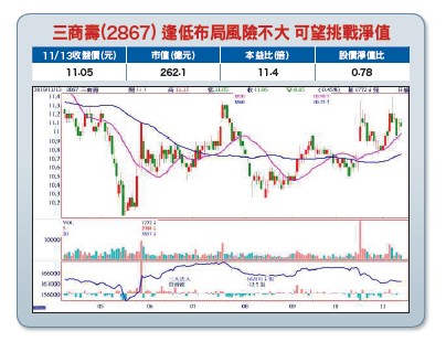 翻開過去台股歷史統計經驗來看,十之八九總是一再重演,但市場大多數專家和投資人為何總是不斷重蹈覆轍而過度追高殺低受傷?就是往往無法克服高檔見利多過於貪婪追高、低檔因利空而恐懼不敢買的人性弱點。記得在上期周刊文章再度提醒大家,過去十年來當十月底十一月初第三季財報和十月營收公布近尾聲時,提防短線利多出盡拉回整理至少到十一月中前後。這次下來指數至少回測月線上下,多則季線上下。果然在十一月十一日一根中長黑指數已回到月線上下,故針對後市看法仍不變,OTC指數已殺到逼近季線上下,所以集中加權指數要守穩月線就往上攻的機率應較低,差別只是短線直接破月線下去?或是月線附近稍作反彈再下去季線附近?萬一原本有可能達成第一階段協議的美中貿易戰又突然破局,則就提防快速拉回至年線上下。個股操作部分,大多數電子第三季財報和十月營收雖好,但因基期高且將進入傳統淡季,果然如我之前所言是這波回馬槍殺盤重心,許多人氣中小型電子股不是已相對弱勢回到季線上下,甚至已跌到半年線或年線正在做中期回檔修正中。所以未來總統大選前指數若來撐在相對高檔,或許可能就要動用到股價仍在長期低檔區的壽險權值股。壽險股因避險成本造成今年無法配息或低配息,加上市場擔憂明年壽險責任準備金利率包括外幣、新台幣可能都會調降,進而提高保費而影響保費收入,也因如此今年壽險股幾乎都沒漲到,而在相對低檔打底近一年。三商壽(2867)受惠今年債券殖利率走低,其攤銷後成本(AC)項下有四三八億元的未實現獲利,比去年底增加逾七百八十億元。以及第三季股息入帳和投資收益認列增加,累計前三季EPS為一.四七元,預估全年有機會挑戰二元上下。同時因為資產未實現價值增加,三商壽淨值比去年底增加一○一億元,達三六一.六億元,每股淨值為十五.二元。董事會日前亦通過,二○二○年要更改會計政策,即投資性不動產要改採公允價格模式(即用市價列帳),若向金管會申請並獲准後,則從二○二○年一月一日起,其帳上二百多億元的投資性不動產會採市價列帳,扣掉稅費,預計淨值會增加二五.二億元,等於每股淨值可望來到十六.二元上下。股價已在低檔打底近一年,逢低可留意布局,未來不排除有機會補漲來挑戰每股淨值上下。