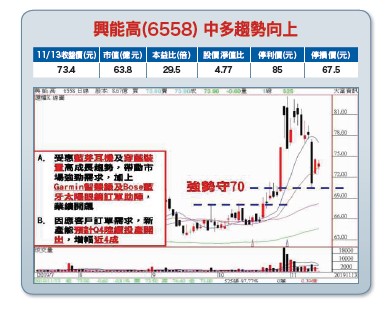 (2)穿戴裝置起飛,Garmin及Bose訂單助陣:智慧穿戴裝置商機大,據Gartner數據顯示,智慧手錶今年全球市場規模高達一六二億美元。耳戴裝置出貨量明年之後更將大躍進,全球穿戴式裝置市場進入高速成長期。據悉,興能高陸續取得導航裝置龍頭大廠Garmin智慧錶,以及美商Bose的藍牙太陽眼鏡訂單,今年起將放量出貨,以及可望打入蘋果新一代耳機AirPods Pro供應鏈,增添營收成長動能。除大幅擴張新產能,也積極開發新產品,採異型電池的頭罩式耳機已拿下一美系客戶訂單,月產能明年目標二十萬顆。受惠穿戴裝置高成長趨勢,目前訂單已看到年底,因應客戶訂單需求,目前昆山一廠月產能提升至四百萬顆,昆山二廠產能第四季開出,總產能來到每月五百萬顆,增幅近四成,另外一百萬顆產能將視市場需求增加,業績成長爆發力強勁。【操作建議】低接不追高,在中多趨勢向上、法人力挺偏多不變,下檔只要守穩六七.五元關卡不破,逢低仍可留意(※基本面資料若有異動,依公開資訊觀測站最新訊息為主)。基於風險考量,設好停損停利(詳見附圖說明)。
