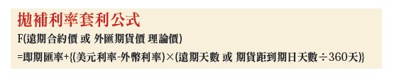 從上述的利率平價理論公式略做調整後,就可以得到「拋補利率套利」公式。從「拋補利率套利」公式,咱就可以用外匯銀行或外匯經紀商的即期匯價,換算成遠期合約或是外匯期貨的合理價格。如果兩者之間出現短暫的偏離,而且偏離值大於交易成本時,就會引發套匯交易,最終即期匯價與遠期或是期貨的價差偏離就會收斂。這種交易模式在國外的投資銀行,或是以匯市為主要交易商品的大型專業投資法人,是相當常見的。對於剛接觸外匯期貨,常常因為外匯期貨換月之後,技術線圖出現缺口,而感到困擾,或是擔心程式交易因為換月的缺口,造成不必要交易的投資朋友們,其實可以外匯即期匯市的技術面,取代外匯期貨的技術圖,就可以免除換月造成的水差缺口。只要在交易委託的價格方面,用「拋補利率套利」公式去換算合理的期貨價格,就可以擺脫即期匯市價格與外匯期貨價格之間的價差問題。