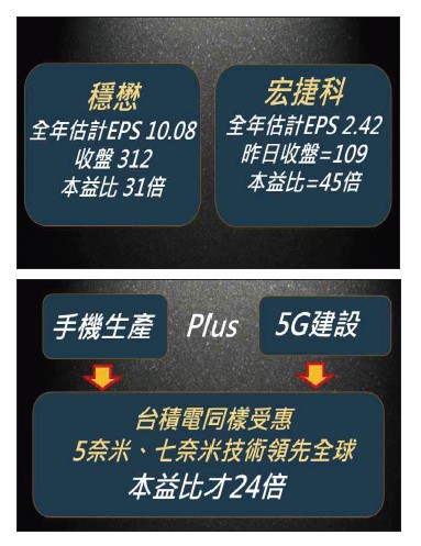 中國5G建設如火如荼,砷化鎵功率放大器晶片(PA)的需求量同步爆發,5G手機的PA用量是4G的二到三倍,5G基地台的PA用量則是4G的四倍,穩懋、宏捷科代工生產PA,帶動兩家公司近半年來營收,幾乎每月年增率都呈現雙位數成長,股票也成為投資人追逐的焦點。傳三星導入指紋屏下辨識 利多加碼今年十一月七日,穩懋、宏捷科又有利多新聞傳出,三星兩款旗艦機Galaxy S10、Note10導入指紋屏下辨識的解鎖功能,卻接連發現用戶只要貼上螢幕保護貼,非用戶指紋也可以解鎖手機。嚴重的安全性漏洞,使三星決定明年S11、Note11兩款手機,將改採蘋果iPhone採用的3D臉部辨識技術。三星導入臉部辨識,台灣廠商穩懋、宏捷科因為生產3D感測元件,業績展望看好。PA和3D感測元件兩大利多加持,投資朋友一定預期,穩懋、宏捷科的股價應該持續攻頂。但出乎預料的是,兩家公司的股價卻在十一月六日和七日接連兩天重挫。不是利多嗎,股價怎會不漲反跌?深究原因,股價過高的疑慮絕對不可忽視。本益比偏高 短期陷入漲多拉回首先,我們來看看穩懋的股價是否合理。穩懋今年前三季EPS六.一八元,若第四季的表現和第三季相同,全年EPS可望達到十.○八元,以本文撰稿當天(十一月七日)的股價三一二元來看,本益比高達約三十一倍。再看宏捷科,前三季EPS一.五一元,若第四季的EPS和第三季表現相同,全年EPS可以達到二.四二元,以本文撰稿當天的股價一○九元來看,本益比更是高達四十五倍。這樣的本益比合理嗎?本益比高低取決於產業的前景,以及公司未來的競爭和獲利能力,合不合理一比就知道。穩懋和宏捷科的利多題材,純粹是手機的應用和5G建設,如果拿同樣受惠這兩大題材的台積電來比較,便可以發現穩懋和宏捷科的股價真的太貴了。台積電身為全球晶圓代工龍頭,五奈米、七奈米技術稱霸全球,蘋果、華為等知名品牌手機的處理器晶片,都不能沒有台積電的技術參與,但台積電目前的本益比只有二十四倍。台積電地位不可取代 本益比卻更低日前傳出,華為遭到美國技術封鎖,美國廠商被禁止出口5G建設的關鍵原料,中國因此採取去美化的動作,有意扶植海思設計PA晶片,將PA晶片代工生產訂單,從穩懋和宏捷科身上,移轉到中國的三安集成。