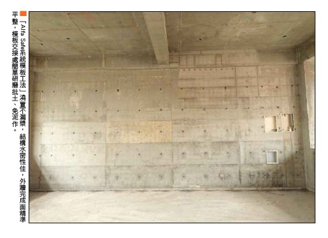採用日式清水模板的嚴謹施工標準:柱牆模底部水平板的施作、斜撐鍊條控制牆體精準度、樓層交接面延續的平整控制、以水線嚴格控制樑外側的直線精準度…等,執行上以柱牆採用系統模板為主加上樑板採用夾板模為輔,不但能符合多樣尺寸建築設計,且完成面精準、免泥作之要求,對於人力上的需求相對降低,而免泥作工法將會是台灣未來建築系統化及環保綠建築的新趨勢。然而「Alfa Safe系統模板工法」施工成本加上營造最後的研磨及修補費用,相較於傳統模板工法施工加上泥作打底粉光之工料,尚有些成本增加之差異,建議建築規劃階段即導入系統模板工法,於結構設計時減去牆樑之泥作打底水泥砂漿重量,以實際的輕量化建築重量作結構設計計算分析,可再減少鋼筋及混凝土成本約一坪七百元至九百元,則執行成本將更接近。