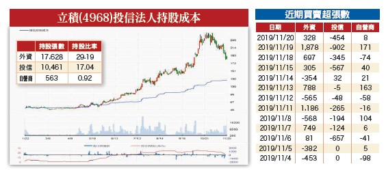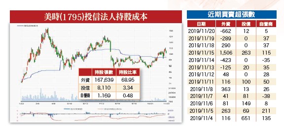 更要注意的是,在這二○檔投信賣超股中,居然有十四檔都跟5G題材有關,佔比高達七○%,同樣有在市場熱頭上逢高調節的跡象,投資人對此族群的操作恐怕需要提高警覺了。當中,風險最高的個股就是前面已提到的立積,因目前投信持股仍高達一萬張,佔總股本近十七%,且股價已跌破季線心理關卡,投信獲利賣壓勢將陸續出籠,尤其投信年底拚績效,砍排名前面基金的持股最有效,不排除還因此演變成投信多殺多的走勢,屆時股價修正幅度恐會更大。由於立積的Wi-Fi FEM(路由器使用)是投片在宏捷科(8086),投片量預計將從目前每月三千片,一路增加至明年底的六千~七千片。立積的手機Wi-Fi是投片在穩懋(3105),目前投片每月一千片,主要供應OPPO手機802.11ac規格,華為訂單則將新增每月三千片的投片量。一旦立積股價出現大幅度重挫,市場難免會開始聯想陸系供應鏈搶單的傳聞是否成真,連帶替其代工的宏捷科及穩懋也有掉單風險,不利兩者的股票表現(宏捷科已出現在投信調節名單中)。強勢非電子族群成新寵其次,再看一下十一月以來投信買超最多的新認養股(持股達三%以上)有那些?從表格二中,可發現投信買超的族群較為分散,有華通(2313)、台郡(6269)、博智(8155)、景碩(3189)等印刷電路板,也有聯詠(3034)、茂達(6138)、祥碩(5269)等IC設計,以及美時(1795)、鈺齊-KY(9802)、百和(9938)、六角(2732)等非電族群。投信買超第一類的印刷電路板,偏向是與賣超股中的銅箔基板,進行換股操作,IC設計同樣也有換股的意味。最大的差異在於,投信從原先清一色的電子股,開始轉向布局非電族群,這點是可明顯看出避險的操作。不過,所挑選的非電子股,也是技術面較為強勢的個股,顯示投信仍偏向操作強勢股,追求短線績效。考量加權指數的位置,投資人在跟單操作上,挑選股價尚未大幅噴出的投信買超股,或許是較為安全的操作策略。美時市佔率提升故事獲資金認同短線可關注學名藥廠美時的表現,近期的亮點在於戒癮含片原廠授權學名藥將退出市場,美時的戒癮含片學名藥的市佔率有望提升,進而成為推升獲利增長的動能。Buprenorphine/Naloxone是美時挑戰專利的P4學名藥,原廠為Indivior的 Suboxone (舒倍生),美時在取得藥證後已於今年二月正式上市。但學名藥上市後侵蝕原廠藥市佔的模式,並未在戒癮含片學名藥上完全複製,截至今年第三季原廠Indivior的舒倍生還保有原市場份額的近五○%市佔,且已銷售的學名藥中授權學名藥就佔了約五二%。隨著美國新法案通過,此情況恐將出現轉變,法案變更藥品平均製造價格的計算方式,Indivior若繼續維持授權學名藥則必須提供公保單位更多的折扣,而導致無利潤空間,Indivior已決定在今年底中止授權學名藥,這塊就是美時的機會。