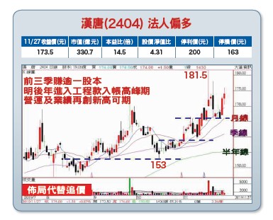 台股創下一一六六八點近期波段新高,在市場居高思危心理影響下,短線稍作震盪整理其實是滿正常的現象,重點是這一波由總統大選暖身起跑,以及資金瘋狗浪所引動的大行情,是否會因為短線的量縮震盪而改變?老師認為並不會:一、就經濟面角度,主計總處再度上修第三季國內經濟成長率GDP概估值至二.九一%後,受惠美中貿易戰緩解、台商資金回流、部分產線轉移回台、轉單效應,加上5G基礎建設加速推動及原物料續跌空間有限,台經院亦同步上調今、明兩年GDP成長率,顯見國內整體經濟仍可望續維持穩步成長,亦有助於支撐台股持續向上。二、就資金面角度,歐美央行大降息,並重啟QE購債計畫,配合台商資金回流,在市場資金不斷湧進挹注加持下,台股或美股都有機會再走出一波大多頭行情。三、就籌碼面角度,這一路以來,外資持續看好作多台股的企圖心並沒有改變,加上內資買盤回籠、政策面偏多,有利於股市進一步向上推升。短期在市場居高思危下,買盤相對謹慎保守,且成交量遲遲無法有效擴增,不過大家須知:在多頭格局不變下,量縮並不可怕,怕的是出現放量不漲的情況!多頭量縮乃代表市場惜售,通常經過震盪換手整理過後,後市行情還是會再往上攻。況且,在量縮震盪過程中,可以看到有許多中小型轉機成長股表現仍非常亮眼,在多頭格局不變,且主力控盤者作價企圖心仍是欲罷不能下,短線若有震盪拉回逢低都仍是「挑好股、買主流、賺大錢」的好機會。【個股推薦】漢唐(2404)主要業務為服務高科技產業之建廠及擴廠計畫,包括整廠建設服務、無塵室整合服務、機電整合服務、Hook-UP工程等。主要利基題材有: (1)前三季賺逾一股本,業績表現亮眼:第三季雖處工程款收入淡季,合併營收季減二七%達四二.四二億元,年減二.六%,平均毛利率一九%表現還不錯,營業利益季減三一.八%達五.九三億元,年減九.七%,但因業外認列江西建工股利,歸屬母公司稅後淨利季減二四.七%達五.六六億元,年減二九.一%,每股淨利二.九七元,符合市場預期。前三季合併營收一六七.四四億元,年成長六一.四%,平均毛利率持平在一八.三%,營業利益二三.三一億元,年成長七七.七%,歸屬母公司稅後淨利二○.三三億元,年成長四四.三%,幾乎快追平去年全年獲利,前三季每股淨利一○.六七元,已賺逾一個股本。