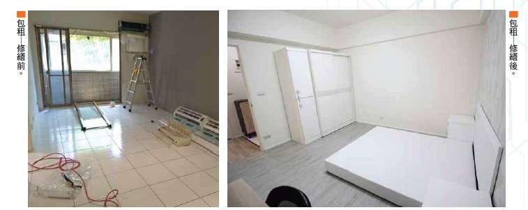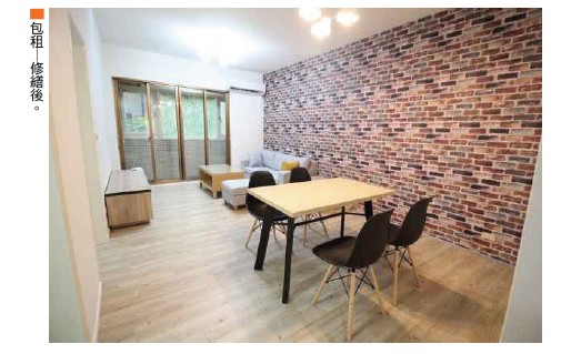 「包租代管」是這兩年被市場炒熱的話題,早在多年前,聯勝房屋就已經開始少量的代管業務,就是把代租做得像代管一樣,收取一○%的管理費,為了增加服務品質,林政緯開始培養自己的修繕工班,隨傳隨到,維護房東與房客的關係,後來又增加裝修部及裝潢部,聯勝房屋成為市場上少見,擁有一條龍服務的房屋租賃公司,也為日後「包租代管」的事業體打下深厚的根基。「我們不主動推出包租,通常都是房東遇到不好的房客、房租欠繳或房子被破壞時,才會推包租。另一方面是資金問題,假設物件重新整修裝潢要花二十萬,一個月五間花費一百萬,持續半年就要六百萬,租金還沒到位,就要花六百萬營運資金,確實是一項沉重負擔。因此,目前策略是代租為主、包租為輔,以代租養包租,精算可獲利的空間才會接案。」林政緯表示。他舉例,建國高架橋下陽光加油站旁的物件,該房屋老舊,又因為地震的關係,牆壁水泥剝落,房東不願花錢修繕,因此找上聯勝房屋,聯勝評估後,決定用原價二萬二千五百元向房東包租,整修到約七、八成時,房東曾去視察,很訝異地說,「一開始就應該跟我推包租了!」從原本廁所磁磚掉落,進去都會割到腳,經整修過後美輪美奐的空間,包含燈具、沙發、床鋪、油漆全部更新,完工後短短五天就租出去。公司跟房東簽約五年,房租直接調到三萬,第一年租金就回本,後面四年就是聯勝的獲利。整修美化推升價值 提高出租率