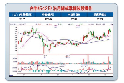 因市場仍期待美中近期有機會達成第一階段協議,十一月至今,台股持續在一一四○○至一一七○○點高檔震盪,等待美中進一步消息的確認。若月中前釋出確認第一階段簽署日期或暫緩十二月十五日加課關稅利多,台股才有機會上去挑戰一一八○○至一萬二千點,之後因外資準備放假,十二月下旬至明年一月初在高檔震盪等待總統大選。底部起漲績優股 風險相對有限萬一若十二月十五日不如市場預期而如期加課關稅,則提防類似今年五月和八月,加權指數破季線回測年線上下打底完再上來。指數高檔震盪整理,重點就是在選股,追錯高檔股讓你住套房。之前大漲的熱門電子族群,繼散熱、PA、5G網通、銅箔基板、立積、雍智科、興能高、智邦、訊芯-KY……等,少則回測季線,多則回測半年線甚至年線上下後,近日果然輪到欣興、南電、燿華和可成……等個股破季線回檔整理中。相對的,買底部起漲的績優股風險相對有限,且波段較有上漲空間。台半(5425)上半年先是第一季受提列庫存跌價損失,影響毛利率季減五.二個百分點至三三%,又受到消費性客戶調整庫存影響,業績表現不盡理想,今年前三季EPS為一.六八元。不過在電動車需求不斷成長,帶動相關車用零組件訂單明顯成長,加上消費性電子需求穩健復甦,十一月營收九.二七億元,月增二.八%,年增一二.四%,第四季業績可望優於第三季。攻入歐美車用零組件大廠供應鏈展望明(二○二○)年,由於台半已攻入歐美車用零組件大廠供應鏈,業績可望開始全面回溫。法人指出,台半已拿下馬牌(Continental)及博世(Bosch)的車用電子保護元件訂單,預期晶圓出貨量與今年下半年相比將可望翻倍成長,成為帶動毛利率及獲利成長的主要關鍵。不僅如此,大陸廠商陸續去美化,可望逐步加大採用台系車用二極體供應商,其中台半具備自有產能,且現在台半已與聯電結盟,未來也可望有聯電產能奧援,有機會接下更多車用二極體訂單,推動業績更上一層樓。法人預估台半今年EPS約二.二至二.六元。