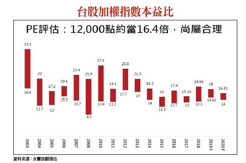 不過,根據華爾街的最新預測,美國標普五百企業獲利年增率的最壞狀況應該就是今年第三季,第四季的獲利年增率有機會由負翻正;而二○二○年首季的獲利年增率預估約四.○四%,緊接著第二季至第四季,獲利年增率為逐季擴張。按照此預估,即便S&P500指數維持高檔區間整理而不回檔,其整體本益比也能逐季降低,等於是以時間換取空間的軟著陸,化解市場泡沫化的疑慮。目前S&P500指數的本益比約十九倍,二○○○年網路泡沫時期約為二十六倍,二○○八年金融海嘯前後,最高曾達近二十倍。與歷史曲線比較加上低利率因素,目前本益比雖不低,但也不高。因此,對美股後市不能預設立場,若未出現新變數以前,或者獲利年增率被市場下修以前,美股指數維持高檔區間波動的時間有可能拉長,投資人不追價的耐性也可能倍受考驗。台股本益比位於歷史中間位階再來觀察台股算不算貴。若以指數而言,一萬二以上的點位已開始逼近歷史高點,不能算低。但是股價終究是反映公司的獲利程度,若以本益比位階來看,目前約為十八倍,以歷史的角度而言,屬於平均中位數,並未偏高。再者,根據各法人機構的報告顯示,台灣整體上市櫃公司二○二○年的獲利年增率估約一○~一五%區間,以目前一萬兩千點的位階計算,本益比將下降至十六.四倍以下,一點都不高。因此,在全球未出現新變數以前,以台股高達約四.○%的股息殖利率,對資金是相當具吸引力的。所以,資金持續駐足台股的研判,也是順理成章的,市場法人面臨的是選股問題而非如何退場的問題。外銷訂單不如預期 漲幅大者不宜追高日前台灣綜合研究院不僅上修二○一九年台灣經濟年增率至二.五九%,並認為明年將因國際環境改善,以及民間投資增加,將帶動二○二○年台灣經濟成長率達二.六三%,超過主計總處預估的二.五八%,也是至今各機構的最高估值。