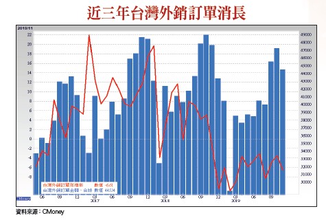 台綜院也針對電子製造業表示,電子業附加價值占GDP近一六%,台灣出口高度集中於電子產品,其中半導體更占所有電子產品出口的六九.五%。因此,明年的成長關鍵,必須關注半導體業的表現。我們間接推論,台股指數挑戰歷史高點能否成功,關鍵點也在半導體的成長概況。至於短線上各族群的表現,將取決於接單的變化。根據經濟部統計處新公布的十一月外銷訂單統計,訂單金額為四四五.三億美元,較去年同期減少六.六%,跌幅較預期擴大,為連續十三個月負成長,官方單位預估全年將衰退五.三%。衰退擴大主要是來自手機跟平板訂單減少,因去年國際品牌手機上市時間較晚,手機單價較高,反觀今年手機新品提前上市,且平均價格偏低。另外,筆電及平板訂單受到中美貿易戰影響提前拉貨,因此十一月接單金額比去年少。不過,其中仍有接單亮點,電子零組件產品呈現唯一年增率正成長,且是連續兩個月正成長。主因5G通訊、人工智慧、高效能運算等新興科技應用需求擴增,加上穿戴裝置陸續推出新品,帶動晶圓代工、IC設計及印刷電路板等供應鏈需求持續成長。統計處預估,十二月外銷訂單將落在四二八至四三八億美元,約落於年減一.三%至年增一.○%區間。