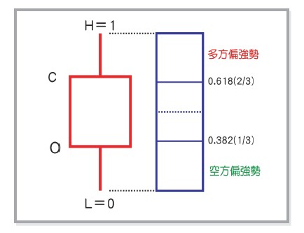 我們再來看附圖二的K棒圖,一根K棒由開高低收所組合成,在技術分析中最重要的就是要先判斷多空趨勢,再判斷多空強弱。在中庸之道有提到,不偏不倚就是中庸之道,用在技術分析上,不多不空的均衡點就是中庸之道,我們稱之為多空線。在多空線之上偏多,在多空線之下偏空。在一根K棒的中庸之道為最高與最低的一半處,我們稱之為均衡點。今天可以收在均衡點之上就是偏多頭贏一點,今天若收在均衡點之下就是偏空頭贏一點。再來我們把最高與最低這一個距離當作一個箱子,作0.382和0.618的三分法來研判多空強弱,若可以收在0.618之上,則今天多頭偏強勢,若收盤收在0.382之下,則今天空頭偏強勢。