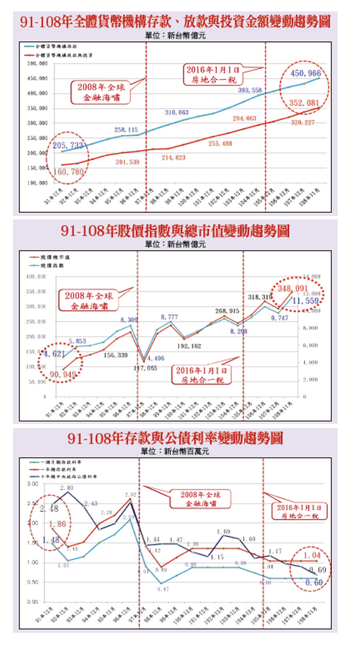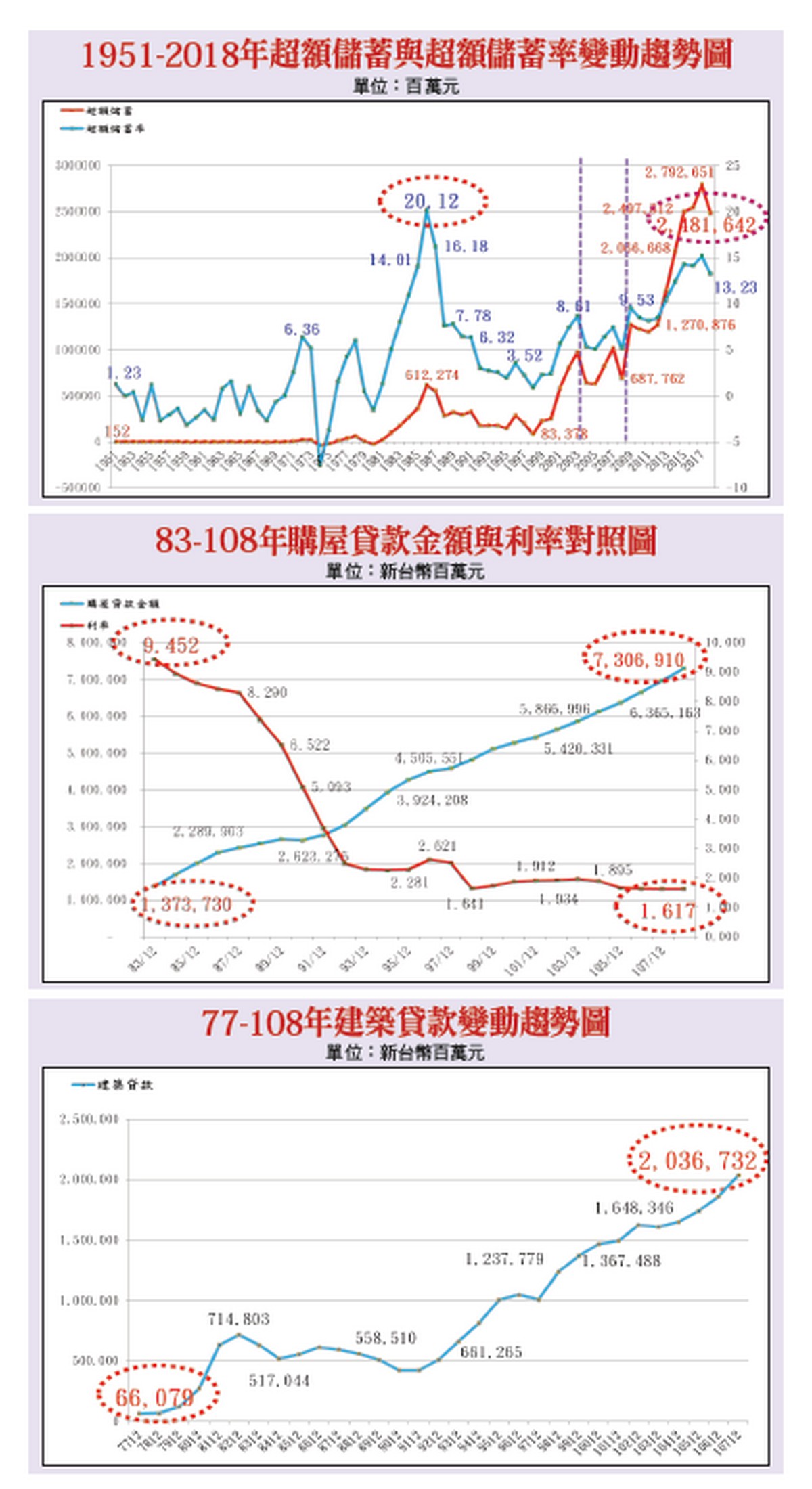 由以上之分析,如再深入探討國內歷次房價漲多跌少之背景因素,當可了解當前房價該跌不跌之主要原因係緣於錢多、利率低,龐大的超額儲蓄沒有出路,此際又逢美中貿易戰所引發台商大量回流,無形中又導致緩慢下跌的房價該跌不跌,此一情勢應是各相關主管機關始料未及。如上所述,二○一五年至今房價跌幅約僅兩成,顯然不如預期,此亦可由附表101Q4-108Q2住宅價格指數之變動趨勢充分了解(詳請參閱附表),其次,如再由現階段房價議價空間仍普遍存在一○%至一五%加以觀察,此際應該還有不少預售建案餘屋積極進行促銷之中。因此,可以預見的是,未來三至五年之內整體房市仍以好地段的區隔產品為主,至於目前預售個案銷售順暢者,則又與錢多利率低息息相關。房價為何該跌不跌?─錢多利率低圖一長久以來,國內房價漲多跌少,二十年前巢運即點出此一長期存在的高房價問題,並且高房價所得比,卻同時存在高空屋的矛盾問題。台灣稅制較歐美輕,面對炒房、高房價問題,政府三不五時提及要「以稅制價」對策,亦即加重房屋持有稅與交易稅問題,惟截至目前為止,仍未見進一步的稅制改革。房價該跌不跌,不少人認為是美中貿易讓「台商回流」拯救了台灣經濟,其實自從二○○八年全球金融海嘯之後,主要國家的QE(量化寬鬆)政策,進一步開啟了全球「錢多利率低」的經濟環境,再加上台灣的超高額儲蓄率,迫使資金轉往股市、房地產流竄。QE成為全球經濟發展助力,美中貿易再推了台灣經濟一把,搭配台商回流,帶動房市需求,現階段政府如能搭配因應台商回流開闢的產業園區與軌道經濟,制定出一套完整的產業升級策略,便能藉此機會調整產業結構,促進消費並增加就業機會,再帶動住宅實質需求。金融數據暗藏密碼─存放款差距大+股價市值驟增根據中央銀行公布數據,二○○二年至二○一九年十一月,全體貨幣機構存款自二○.五七兆元增至四五.○九兆元;全體金融機構放款自十四.七六兆元增加至三○.三七兆元。另外,股價指數從四六二一點逐年攀升至一一五五九點,股價總市值從九.○九兆元驟增至三四.八○兆元(詳請參閱附圖)。圖二十七年來,股票市值漲幅高達二八二%,顯示多年來資金大都流到擁有股票的富人手中,導致貧富懸殊逐漸擴大。另外,過去「一個月期存款牌告利率」為一.四八%,相較當前○.六%的利率,在錢多利率低的時空背景下,依傳統經驗,資金自然會選擇房市駐足,惟未來在持有稅與房地合一稅高稅率把關情況下,無論是購屋或投資置產,事先都應該仔細的盤算一番。其次,三十一年前,購置住宅貸款金額僅三一三○.五四億元,如今則驟增至七.三○兆元,並且建築貸款亦由四○八.九五億元,一路攀升至二.○三兆元,其間差距甚大,這也正顯示長久以來房價始終難以壓抑之主要原因。另外,根據五大銀行包含台新、合庫銀、土銀、華銀及一銀的購屋貸款利率,從一九九四年七月的九.一九%一路降至一.六一%(詳請參閱附圖),在「錢不值錢」的情況下,資金自然會往獲利較高的市場流動,導致貧富不均,富人越富、窮人越窮,連帶衍生不敢結婚、不敢生小孩以及晚婚等諸多社會問題。因此,今後政府更應積極探討問題癥結所在,並積極尋求解套良方,否則不僅房價高懸無解,未來在人口逐漸遞減情勢下,勢必又會衍生更多的無解難題!