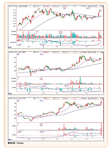 股匯市訊息萬變,提供讀者完整之訊息,使投資人有清楚的投資方向以及對股票有更深的瞭解,欲知更多本篇精彩內容,請繼續往下參考。本周精選產業基本面前景展望佳,浮現合理投資價位,外資、投信搶收市場籌碼,市場籌碼穩定度升高,股價有機會走出波段漲勢鏢股:台光電(2383)、優群(3217)、凡甲(3526)等。台光電可望供貨三大廠5G手機台光電(2383):銅箔基板大廠,二○一九年十一月營收二二.三六億元,月減三.二三%,年增二六.○六%;一至十一月累計營收二二六.三一億元,年增六.四二%。前三季稅後獲利二一.○五億元,每股稅後淨利(EPS)六.五九元。台光電受惠去年重新奪回蘋果iPhone用銅箔基板(CCL)部分供應權,加上新跨足伺服器、5G基地台市場,效益陸續顯現,營運已開始逐步回穩。展望二○二○年營運,有法人機構指出,預料蘋果今年將開始推出5G新機,台光電可望成功搶下蘋果5G手機用銅箔基板全數訂單,同時,也可望打入三星、華為5G手機供應鏈,預估受惠供貨三大手機廠訂單的加持效應下,今年有望賺入一個股本,再創營運新高峰。法人機構預估台光電營收年增率約七.六五%,今年營收二七六.六七億元,全年EPS一○.八八元。美系客戶新機銷售佳帶旺優群優群(3217):電腦周邊設備及零組件專業廠,二○一九年十一月營收一.八四億元,月減二○.九一%,年增一二.七二%;一至十一月累計營收一九.九五億元,年增二二.四三%。去年成功打入美系手機大廠供應鏈後,適逢第三季出貨高峰,優群二○一九年第三季營運創下「五高」─營收、毛利率、營益率、稅後淨利、單季EPS,前三季累計合併營收一五.七八億元,年增一八.九一%,營業毛利六.六一億元,年增二七.八五%,合併毛利率達四一.九○%,年增二.九三個百分點,稅後純益三.○四億元,年增三二.一○%,前三季EPS三.七一元,優於前年同期,賺贏前年全年總和。