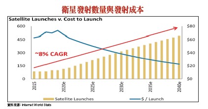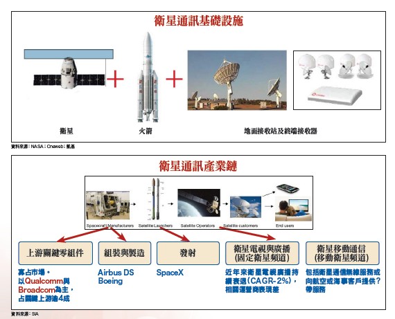 過往發展衛星事業的單位通常為政府,衛星生產多採小批量訂製,造價高達數億美金。但隨行動通訊產業發展,天線與射頻前端(RFEE)技術進步,硬體的組裝能力、電池及處理器元件的技術進步,讓小型衛星的發展具備可行性,並帶動生產成本的下滑。若要在低軌道達成全方位訊號覆蓋,必須投射大量的衛星,小型衛星一般指重量在一百公斤以下的衛星,相較於五百公斤的中型衛星及一千公斤的大型衛星,小型衛星體積更小、重量較輕,表示火箭在同樣的運力下,單次能搭載的衛星數量增加,一次投放更多衛星。由於全球正往低軌道衛星「星系化」的趨勢發展,將使小型衛星大量製造,使用壽命縮短至五~七年,即二○二○年發射高峰所射出的低軌道衛星,在二○二五年開始會有汰換需求,可望讓供應鏈能夠獲得長期穩定的訂單來源。台廠陸續打入供應鏈台灣產業在地面設備發展較成熟,衛星本體製造領域也有切入契機。地面設備方面,包含4G/5G行動通訊、Wi-Fi、衛星電視及VSAT設備等,台灣廠商已切入國外衛星通訊設備供應鏈,未來可升級為系統整合商。衛星本體製造方面,航太金屬零組件、半導體封測業已切入國外衛星產業的零組件供應鏈,有機會從零組件逐步切入系統及次系統領域。目前全球有六個衛星網路計劃正規劃執行中,包含SpaceX、亞馬遜、波音、OneWeb、Telesat、 Planet。Space X的星鏈計畫(Starlink)又是當中規模最大且發展最快的計劃,預計將投入一百億美金在九年內發射一一九四三顆低軌道通訊衛星。隨著火箭回收技術成熟,二○一九年Space X已成功執行兩次發射計劃,共射出一二○顆衛星,預計二○二○年將發射二四次,共一四四○顆衛星,二○二○年中(發射六次後)在北美提供連網服務。衛星計畫將帶來火箭、衛星、地面接收站(VSAT)及終端接收器等硬體設備需求,相關台灣供應鏈有衛星PA的穩懋(3105)、衛星收發器及接收器組裝的同欣電(6271)、衛星及地面接收器PCB的華通(2313)、地面接收站的台揚(2314)、地面接收站被動元件的昇達科(3491)。