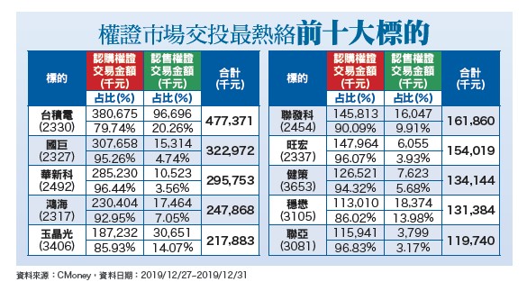 央行總裁楊金龍指出,在美中貿易戰轉單效應下,根據美國政府統計,二○一九年前十月美國對台灣商品貿易順差高達一九二.六億美元,估全年將逾二百億美元。而美國判定匯率操縱國的三項指標,其中一項就是對美貿易順差超過二百億美元,其他指標則為貿易夥伴國有經常帳順差,且金額高於其GDP的二%,以及是否持續性進行單邊外匯市場干預,淨外匯購買金額超過GDP的二%。美股盤堅。電子指數仍守月線之上,短線維持高檔震盪,盤堅走勢未變,金融指數過高後震盪但力守十日線,有機會再創新高;未含金電指數補漲走勢尚未結束,上檔將先挑戰高連高壓力區。台股在守多方缺口下,連五日於七十點不到區間震盪,在美股續創高帶動下一舉突破整理區並挑戰前高,短多氣勢強,過高機會大。歷史經驗,外資買盤將陸續回籠,總統大選,一月十六日台積電(2330)法說,以及美股企業財報公布陸續接近,美中可望簽署第一階段貿易協議,皆有利於台股整理後持續波段盤堅,見到補量後波段行情將啟動。本周權證排行看國巨(2327)。國巨EMS及通路端庫存水位偏低,加上急單需求成長,被動元件二○一九年第四季業績回溫,法人看好國巨稼動率有望由四成拉升至五成,農曆年後稼動率上看六○%至七○%,第一季淡季不淡,今年營收將重返正成長。