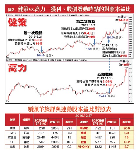 拉回到華爾街日報的主角:台積電與聯發科。由於股票永遠在反映未來,兩檔現在的股價若用二○一九年的EPS計算,本益比早己超過三十倍甚多。要想合理解釋它們的漲勢,僅能說:因為二○二○年高成長,所以用二○二○年的EPS計算本益比,就會低於二十五,就會變得合理。但這裡沒有撻伐之意,投資人唯一能做的,要嘛就是向這個價值輸誠,期待高還有更高的強恆強境界。要嘛觀察傾斜的天平何時回正,讓其他低本益比的個股得到平反。這兩個策略都繫於一個核心標準:個人的風險承受度!筆者再以另外兩檔個股,來解釋「平反」這個概念:「健策」(3653)是二○一九年相當重要的一檔法人認養股,上漲的核心理由是搭上AMD晶片與電動車IGBT(絕緣柵雙極電晶體)的散熱商機;「高力」(8996)是近期轉強的燃料電池股,上漲的核心理由其實是幫健策做焊接。以圖二分別列示它們二○一九年的獲利,以及發動時點的對照本益比。從此圖可以明顯的發現市場的操作邏輯:1.先有一檔領頭羊做二次以上的攻擊,而每次攻擊市場皆以當時能運用的最高EPS、最低本益比來說服自己。2.隨著領頭羊愈漲本益比愈高,市場會自動尋找與之受惠的族群,從中挑選出具低基期(低本益比或低線型)概念者開始操作;股本愈中小,攻擊型態就愈猛烈。不管二○二○年的開月外資會不會歸隊、有沒有元月效應,不管一月十一日的新總統是總機抑或是讀稿機,筆者相信這份本益比對照表的應用(見附表),應該是進可攻退可守的方向,供投資朋友做接下來的研究方向。