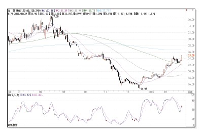 解說:1.立敦最後一波下跌的高點為2011/12/01的17.9,從14.9~18.55出現過末跌高的翻空為多的訊號,之後股價作強勢平台修正,之後於2012/01/30出現KD指標由下往上突破50多空線+三均糾結的耦合效應,當時收盤為19.65到最高點25,其間利潤約27%。2.我們可以發現,一個往上走的驫股經常沿著ma20作擺動,14.95~19.75是突破ma20的葛蘭碧第一買點,之後19.75~17.8的回測ma20是葛蘭碧第二買點。再者,當14.95~19.75出現KD指標由下往上突破50多空線,之後大部分的時間K值幾乎都在50之上的時間最多,這就是偏多操作的訊號。