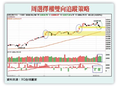 川普投顧再一次發威,不過這次不是中美貿易消息,而是針對波斯灣的原油。國際油價與黃金價格在美伊衝突擴大後,波動瞬間放大,北海布蘭特原油從六十六美元衝上七十美元,黃金則是觸及一千六百美元六年高點。但對於美股影響卻有限,事件爆發後幾個交易日,美股雖然開低,卻在盤中走高收回平盤附近,顯然美股多頭信心仍相當強勁,現階段市場更為關注一月十五日,在白宮簽署中美貿易協議後,第二階段協議談判的相關細節。台股在地緣政治風險造成的資金避險效應影響下,加上目前指數水位偏高,投資人也順著這次事件順勢獲利了結,使台股自一萬二的高檔回到一萬一千八百點的位置。先從技術面分析,現階段指數失守二○一九年十二月十七日長紅K支撐。接下來台股若要止穩,交易量需有所下降,適逢總統大選,預期台股交易量選前開始萎縮,有助於台股走勢穩定下來重新建立整理平台。從型態來看,接下來支撐位置將落在一一四五○至一一六五○點區間。再以法人籌碼布局分析。外資近期在期貨的未平倉部位維持在三萬初,在近年外資籌碼算是相對低檔,顯示外資近期對台股看法偏向保守。接著看自營商的選擇權未平倉部位,首先買權近期仍是Sell Call並落在一萬九千多口附近,賣權Sell Put則是從一萬多口加碼至三萬九千多口附近,顯示自營商認為台股接下來止穩機會相當高。整體觀察下來,技術面較為弱勢,籌碼則是出現止穩跡象。可在總統大選過後,逢低以溫漲(買權多頭價差)策略布局。
