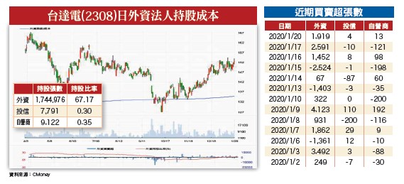 展望二○二○年第一季,預期營收將比去年同期好,主要原因為,合併泰達電效果開始顯現;旗下被動元件廠(乾坤科技)訂單持續走強;工業自動化業務回溫。法人估計因產品組合有利和公司內部生產自動化降低人力成本,毛利率預估可達二七.八%,營益率預估達六.三%,將比去年同期高。法人預估首季稅後淨利約三七.七億元,合每股一.四五元,年增一二%,股價橫盤整理已久,值得追蹤。