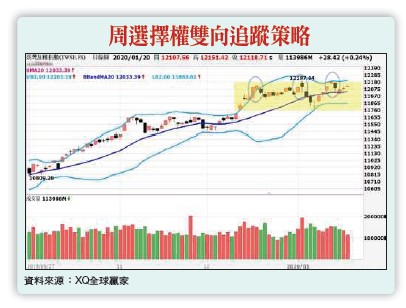 中美第一階段貿易協議的簽署,帶動美股四大指數繼續創下歷史新高,困擾投資人一年多的大石頭,目前看來可以先暫時放下。要針對中美貿易戰做反應,也得等第二階段談判開始以後再說。短線上,市場繼續聚焦在美股最新公布的財報,根據FactSet統計,市場普遍預期S&P 500指數第四季每股盈餘年增率恐將衰退二.一%,但對今年第一季財測預期則相對樂觀,有助美股維持在高檔。農曆新年將至,台股大盤交易量快速萎縮至一千億出頭,在量能不足情況下,指數也難以走出趨勢行情,現階段加權指數仍在去年十二月所建立的平台整理區內來回震盪。從型態來觀察,該區間在一萬二整數關卡,因為同時為去年十二月十二日的多方缺口,因此擁有相對強勁的支撐。上方的一二二○○點則準備在一月三十日開紅盤時,面臨多方買盤的第四次突破挑戰。最後藉由籌碼的布局來觀察。外資一月二十日封關當天在台指期未平倉部位下降至三萬一千多口,顯示外資態度並不積極。但從自營商的選擇權未平倉部位來看,買權轉為Buy Call一萬五千多口,賣權Sell Put則是從三萬八千多口減碼至二萬四千多口附近,代表自營商預期台股開紅盤時,有機會上演向上突破的行情。整體觀察下來,技術面維持中性且行情收斂,籌碼呈現短多長中格局。若農曆年期間,國際地緣政治表現平穩,預期一月三十日開紅盤,台股向上突破機會偏高,若當天外資在期貨未平倉多單再次加碼,有助台股延續上漲趨勢,便可先以溫漲(買權多頭價差)策略來進行布局。