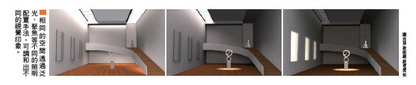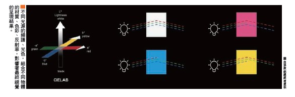 4.調和照明 以局部的目標性照明,搭配周邊環境氛圍式的佈光,建立一種具主從關係層次的照明印象。Q(發哥):我們一般看到光照會呈現出不同的視覺效果,這是如何形成的呢?A(孫總):不同的空間材質在與不同的光源頻譜照射下,因反射率的差異,視覺上呈現的結果自然也隨之不同,例如桃紅牆面以黃光照射應反射六○%以上的光,但若以白光照明,則反射光量將降至五五%以下。而相同光源和不同的材質表面處理,如白光燈泡照射白色烤漆板,可反射九○%的光,因板面對所有顏色進行了反射,所以我們看到物體是白色,如果我們看到黃色,那就是它吸收了藍光,反射了紅光與綠光,但相同白光照射白色石膏板則只有四○%不到的反射光量。這也就是照明設計與材質色彩計劃結合的重要性。