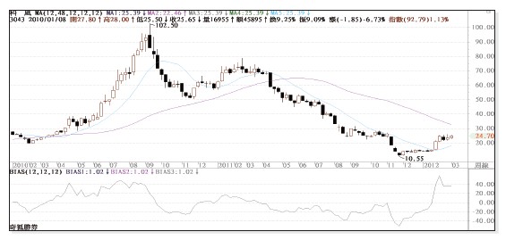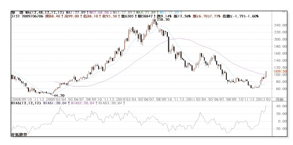 解說:(1)科風於2010/03/19那一週股價由下往上同時穿越十二週均線與四十八週均線,其BIAS(12)也由下往上穿越零軸,並且2010/03/19這一週出現十二週均線與四十八週均線形成黃金交叉,之後股價續漲,展開一波驚人的大多頭行情。(2)我們沿路發現BIAS(12)從2010/03/19由下往上穿越零軸之後,股價都在零軸之上,於2011/09/24出現BIAS(12)由上往下跌破零軸。我們若以穿越零軸作買進,當週收盤為25.1,跌破零軸作賣出,當週收盤為71.6,其間的利潤高達二.八五倍之多。(3)我們不是買在最低點,也不是賣在最高點,只要買對主流股,波段利潤就這麼高,若用本書其他較精細的方法,還可以賺更多的利潤。解說:(1)璟德於2009/02/20那一週股價由下往上穿越十二週均線,其BIAS(12)也由下往上穿越零軸,在2009/04/10那一週股價由下往上穿越四十八週均線,之後又在2009/05/15這一週出現十二週均線與四十八週均線形成黃金交叉,之後股價續漲展開一波驚人的大多頭行情。(2)我們沿路發現BIAS(12)從2009/02/20由下往上穿越零軸之後,股價幾乎都在零軸之上,最後於高點出現頭部背離,再加上2010/08/20出現BIAS(12)由上往下跌破零軸。