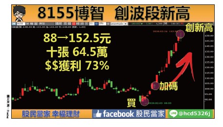 最近美國股市頻創新高,道瓊、標普500、那斯達克紛紛創歷史高,七○%以上的企業,上季財報優於分析師預期,大型股表現相當不錯,加上FED聯準會釋放出今年維持基準利率不動,甚至觀察FedWatch升降息機率表,今年九月降息一碼的機率高於維持不變,這說明十一月美國總統大選時,美股可望再度攀升至另一個新高,助攻美國總統川普競選大位。武漢肺炎疫情仍未停歇,各國積極抗疫,時間拖得愈久,經濟面一定有某種程度的影響,只是輕重而已,最嚴重的中國首當其衝,國際貨幣基金組織(IMF)等大型國際機構甚至預估,今年中國GDP約當五.六%,照理來說中國股市應該是全世界最慘烈的,但是大家不妨去看看上海綜合指數,除了二月三日新春開紅盤大跌超過七%,後面十五個交易日只有兩根黑K棒,指數高點越來越高,低點也越墊越高,成交量也明顯放大,二月三日的大跌空方缺口,迅速被回補,不說根本完全看不出來這是確診人數、死亡人數最多的股市。很顯然這是國家隊的力量,疫情還在蔓延,確診人數多到難以估計,誰也不知道數據是不是真的,這個流氓病毒之狡猾,包含潛伏期長短、無症狀傳染、治癒後再感染等…有許多連專家都摸不透的地方,雖然治療藥物陸續研究中,我們可能要學著跟病毒並存相處,而非想著將病毒全數殲滅,從二月二十四日治癒人數已經高達二.四萬人來看,似乎出現曙光。現階段中國已經出手放水,增加市場流動資金,甚至已經調降一年、五年期的貸款基準利率,分別降十個、五個基準點BP,目的就是希望讓中小企業能夠撐下去,畢竟停工時間長了,絕大部分的微小企業都撐不下去,大企業也會受到重創,規模大的企業,員工成本負擔會更重,其實影響的層面相當廣泛,不小心甚至可能會撼動政治核心運作,所以資本市場一定是中國全力穩住的重點,沒處理好萬一引發外資逃竄,可能會變成金融危機。台灣的經濟跟中國依存度非常高,這就是為什麼美國股市已經創歷史高,甚至費城半導體都有去觸碰歷史高,但是相關係數最高的台積電卻沒有創高,表現疲弱,雖然蘋果降首季財測,但股價老早就創新高,因為需求只是遞延,並非消失,台積電遲早也會創新高,關鍵並非在第一大客戶蘋果身上,而是華為旗下海思,5G的建設被延遲了,影響台積電的部分營收,當疫情緩解也許在第二季會有表現。大家要注意的是避開中國營收比重高的公司,筆者預期三月初公布二月營收時,很多營收來自中國比重高的企業表現可能會比一月更差,大部分能在二月十日復工相當順利,有些甚至拉長到二月二十日或更晚,有復工的企業,到工率也並非百分百,一定會有影響。所以市場資金會趨向集中化,跑到營收向上成長,不受疫情影響,甚至步步高升的公司,例如股民團隊過年前就布局的博智(8155),堪稱二月份最強的黑馬股,新春開紅盤一月三十日到二月二十一日漲幅就逼近七成,現在全市場都知道他的營收月月成長,工廠全部在台灣不受影響,營收比重七成來自高毛利率的伺服器用PCB,產品組合改變三率三升,股價自然飛天,我們領先市場預告,這一檔波段股,有機會成為今年上半年最耀眼的一顆新星。至於下一檔股民團隊認為的波段飆漲股是誰?他也是三率三升,也是跟伺服器相關,產品主攻超高速傳輸線,跨足伺服器產品,嘉澤旗下小金雞,英特爾也是大股東,貿聯-KY為了他的技術也入股投資,股民團隊在二月三日陸股重挫超過七%,市場最恐慌當天買進嘉基(6715),再創佳績,短短幾天波段獲利輕鬆超過二○%,但是團隊認為他沒這麼簡單,因為三率三升股價會飛天,現在才剛剛開始,就像博智一月三十日還被打到跌停,當時只有LEO老師公開講他被錯殺,全體家族成員都要買,現在全市場都介紹博智,投信、外資天天搶買,團隊認為過沒多久同樣戲碼就會出現在嘉基身上了。 想即時把握每個月營收創新高的股票,鎖定電報Telegram搜尋stock17168,股民當家Line生活圈群組@hcd5326j,成為LEO好朋友,股民當家-幸福理財,挖掘股票背後的故事。