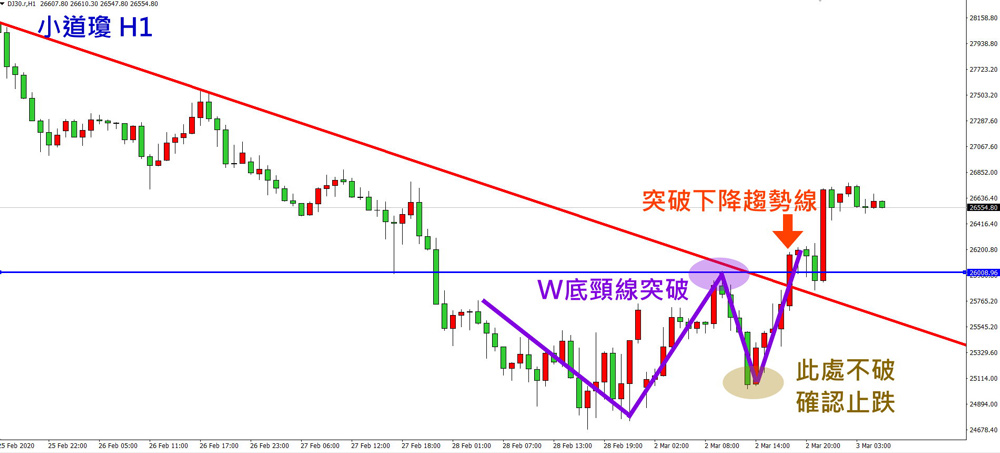 Q武漢疫情全球蔓延,世界衛生組織將疫情等級提高,更警告可能造成全球大流行,人心惶惶,連帶各國股市重挫,光小道瓊上周大跌逾3,500點,恐慌性賣壓出籠,嚇傻所有投資人,直到2月28日,美國聯準會主席鮑威爾出來信心喊話,才為美股拉出止跌訊號,在這樣的背景下,將來怎麼看待美股走勢?A:受全球武漢肺炎疫情影響,單周小道瓊狂瀉三千五百多點,面對殺盤走勢,多數投資人會心生恐懼,無論股票價值為何,總之先賣再說,像這類恐慌型賣壓,市場展現都是直線殺盤,跌得越多,殺盤力道越大。好在聯準會主席鮑威爾出來信心喊話,才穩住投資人,像這類的急殺通常伴隨著急拉行情,形成V型反轉型態,估計未來小道瓊會先走一波跌深反彈,接下來隨著疫情控制程度才會有新發展。比較二○○八年的金融海嘯與現在的恐慌型賣壓,兩者在本質上的起因不同,過去金融海嘯是因為消費力不足,供給過剩進而引爆,這類消費性的起因,政府只要透過量化寬鬆,對市場撒錢即可刺激恢復市場消費能力。但這次武漢疫情引爆,是因為供應鏈出狀況,導致無法供給所致,因此,貨幣寬鬆型的政策對整體經濟而言治標不治本,真正要化解還是須將疫情控制,整個國際供應鏈才會回到原來狀態。就技術分析角度來看,沿著上周大跌可畫出下降趨勢線,在周一的漲勢中已經有長紅突破下降趨勢線,突破前做了一個W打底,搭配下降趨勢線突破點與頸線位置,大抵可以確認止跌跡象明顯,只要W底右腳(咖啡色圈處)不被跌破,還是有一段上升行情可期,萬一跌破,將有機會走第二段殺盤。整體來看,小道瓊短期再下破機率不高,短線上走急拉反彈,中期會進入巨型盤整,投資人切勿追高殺低。
